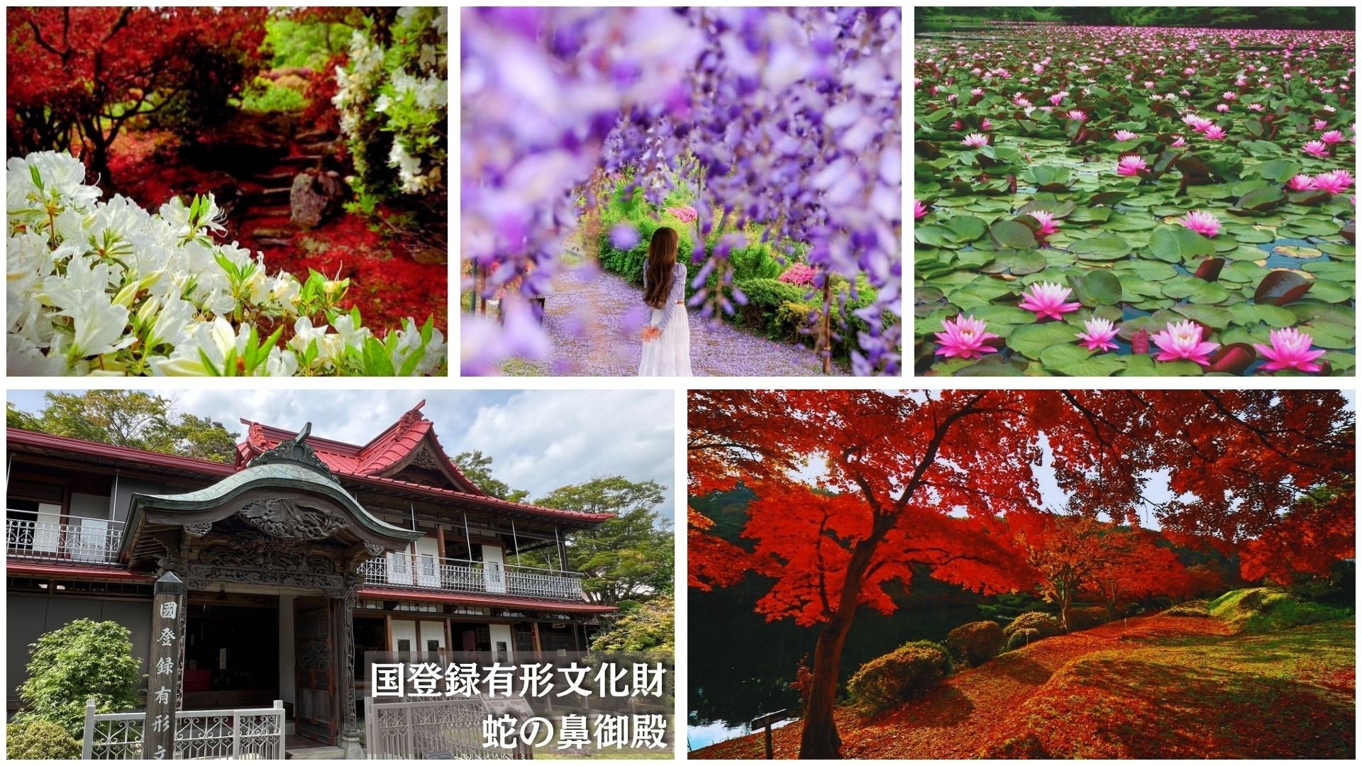 「花と歴史の郷 蛇の鼻」は、福島県本宮市にある観光庭園です。約10万坪(東京ドーム約7個分)の広大な敷地が広がり、四季折々の花々を楽しめます。春はサクラから始まり、フジ、ツツジ、ボタン、バラ、スイレンへと見頃が移ろい、園内を華やかに彩ります。中でも、本宮市の天然記念物に指定されている全長約80メートル超の大フジ棚は、見頃の時期には一面に花房が垂れ下がり、訪れる人々を魅了します。また、秋には400本を超えるモミジが庭園全体を包み込み、季節ごとに異なる表情を見せます。広大な園内では、自然の美しさに触れながら、ゆったりとした時間を過ごすことができます。