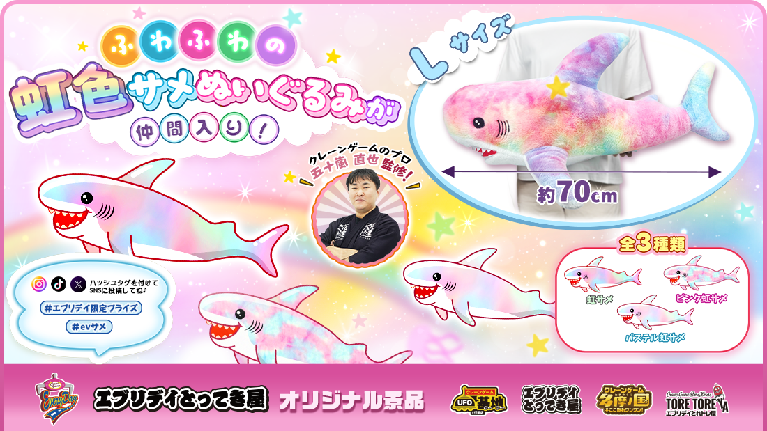 ラインアップは、定番の「虹サメ」に加え、ピンクを基調とした「ピンク虹サメ」、やさしい色合いの「パステル虹サメ」の全3種類。それぞれ異なるカラーリングと雰囲気で、コレクション性の高さも魅力です。ユーモラスで愛嬌のあるフォルムは、幅広い世代のお客様にお楽しみいただけます。