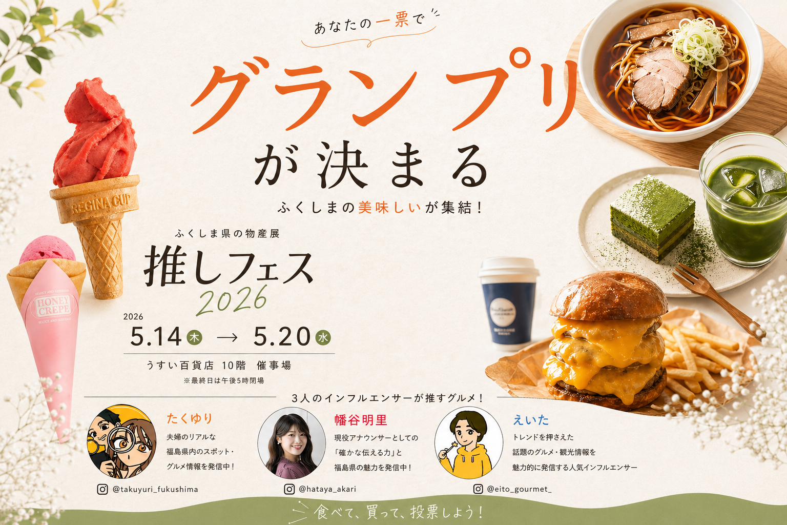 福島民報社が主催し、うすい百貨店を会場に開催する新催事「ふくしま推しフェス2026 ~ふくしま県の物産展~」が、2026年5月14日(木)より初開催されます。