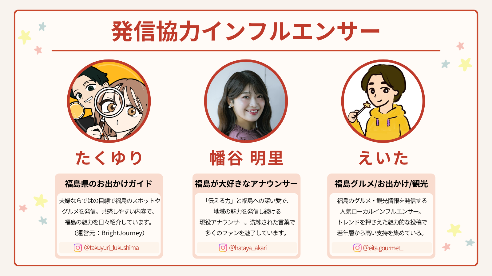 本企画には、福島県のお出かけ・グルメ情報を発信する「たくゆり|福島県のお出かけガイド」、フリーアナウンサーとして地域の魅力を発信する「幡谷明里」、福島グルメ・おでかけ・観光情報を発信する「えいた」の3組が参加します。それぞれの視点から“推し”の店舗や商品を紹介し、SNSを通じて催事の魅力を発信します。