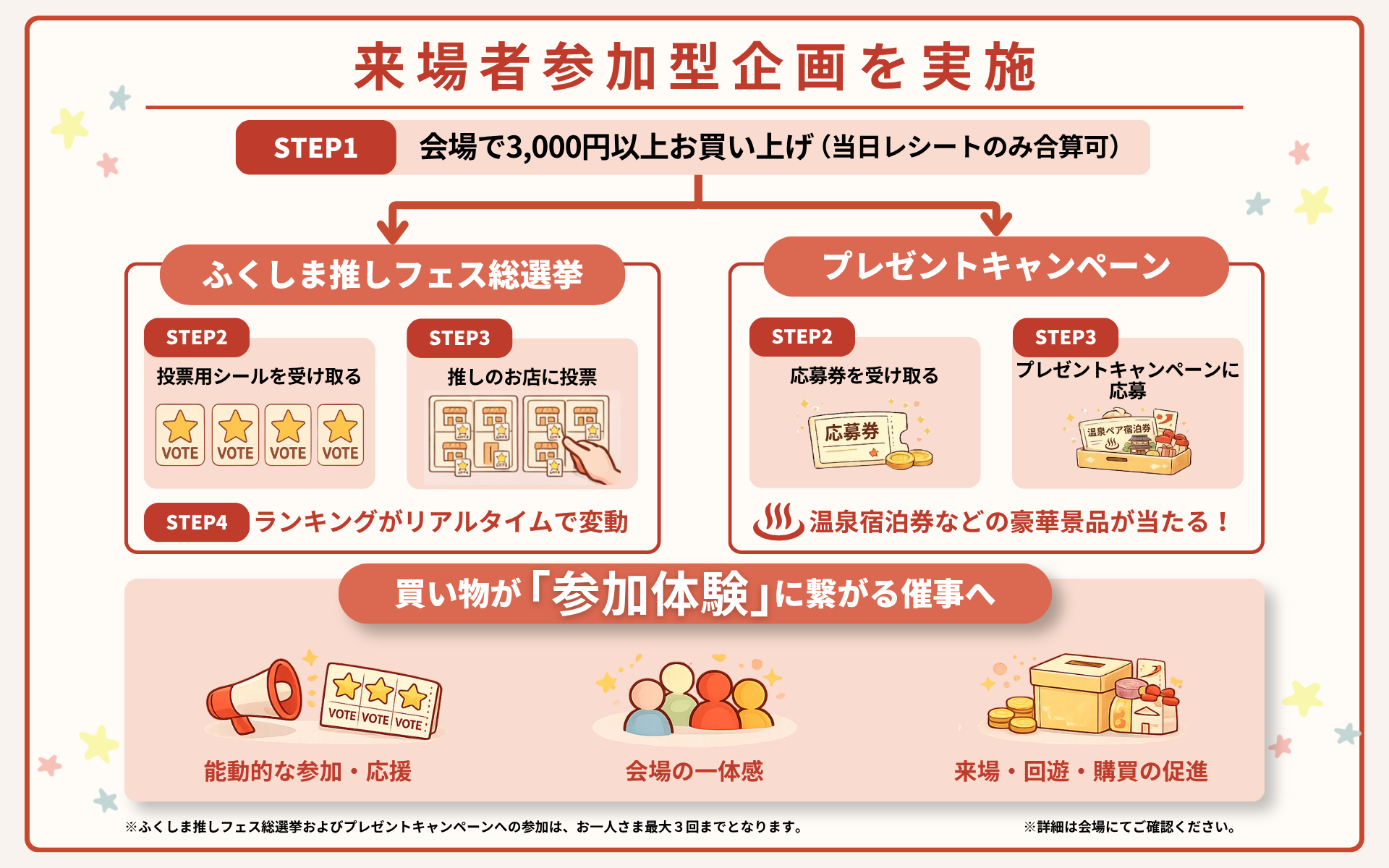 本催事では、来場者が主役になれる参加型企画として、「ふくしま推しフェス総選挙」と「プレゼントキャンペーン」を実施します。会場内で3,000円以上お買い上げのうえ、推し店舗へ投票いただいたお客さまを対象に、温泉宿泊券などの豪華景品が当たるプレゼントキャンペーンも展開し、買い物そのものがイベント体験につながる催事を目指します。