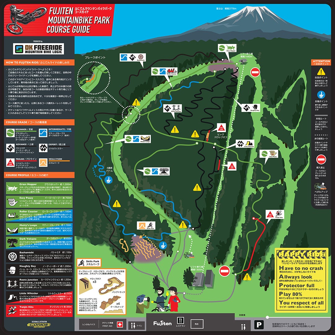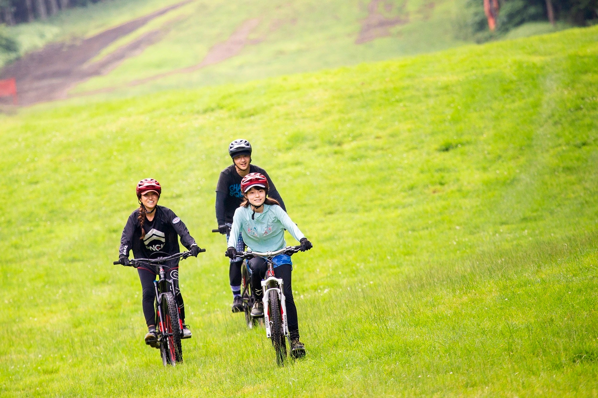 プロMTBライダー・高橋大喜氏が監修を行い、ビッグジャンプが連続する「リトルウィスラー」など上級者でも満足できる本格コースが揃います。また、芝生のゲレンデを駆け降りる「グラスホッパー」など初心者でも走りやすいコースも整備されています。2026シーズンよりコースを2本増設し、さらにコースバリエーションが充実しました。レンタルバイクも様々なグレードのものが揃っており、幅広いレベルに対応しています。