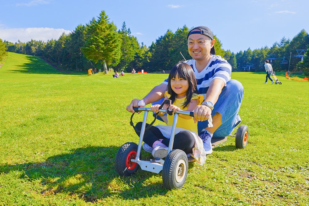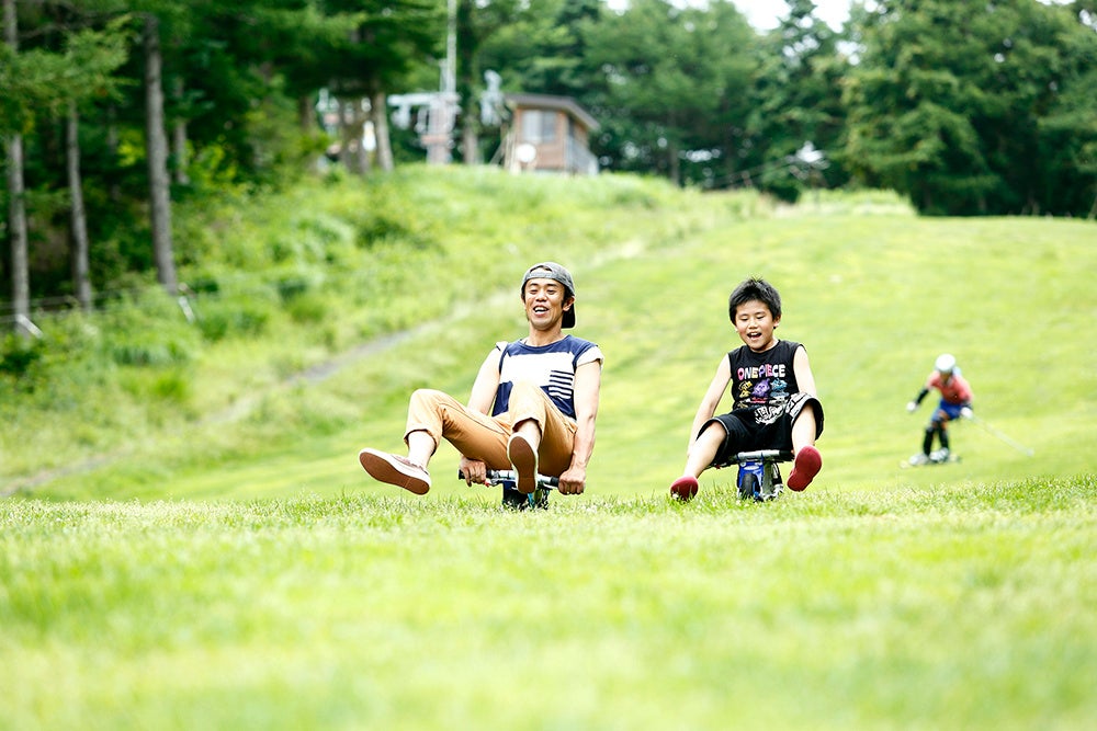 営業を開始するのはゲレンデや森の中を走る「マウンテンバイク」と、1300mの芝生のゲレンデを駆け降りる三輪カート「マウンテンカート」、さらにポッカールやグラススキー、マウンテンボードなどバリエーション豊富な「グリーンスポーツ」です。子どもから大人まで楽しめるアクティビティが揃い、レンタル品も充実しているので初めての方でも気軽に体験できます。