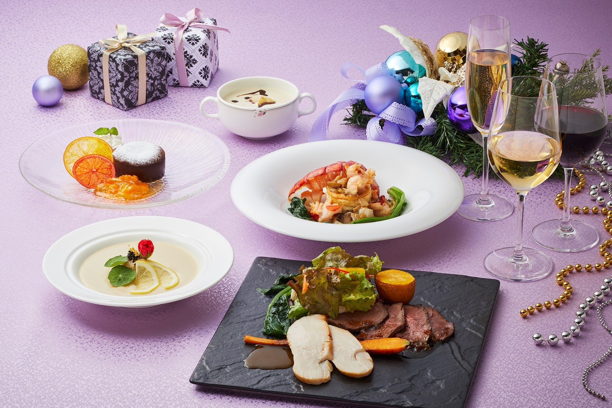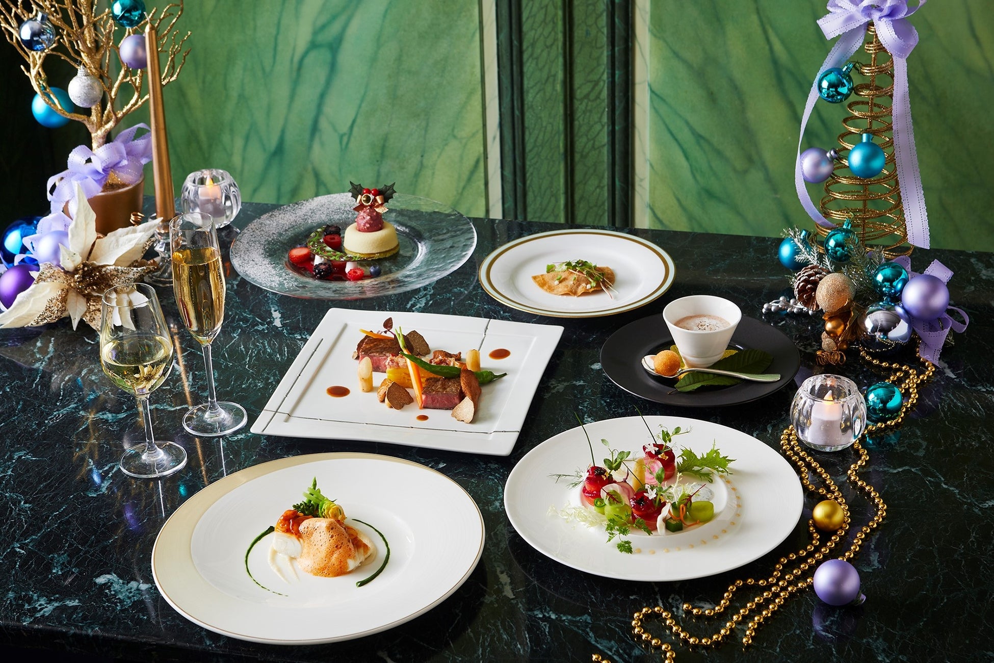 今年は、彩りも美しいサーモンのマリネとマスカットのサラダや、香り豊かなソースをまとわせた、ふわふわ食感でお楽しみいただくヒラメのポッシェとオマール海老などをご用意。メインディッシュは、和牛ロース肉ポワレ、または京鴨胸肉のローストからお選びいただけます。素材や風味を最大限に生かし、クリスマスらしい美しい盛り付けで、目にも鮮やかに仕上げたクリスマスディナーコースで、煌めく一夜をお過ごしください。