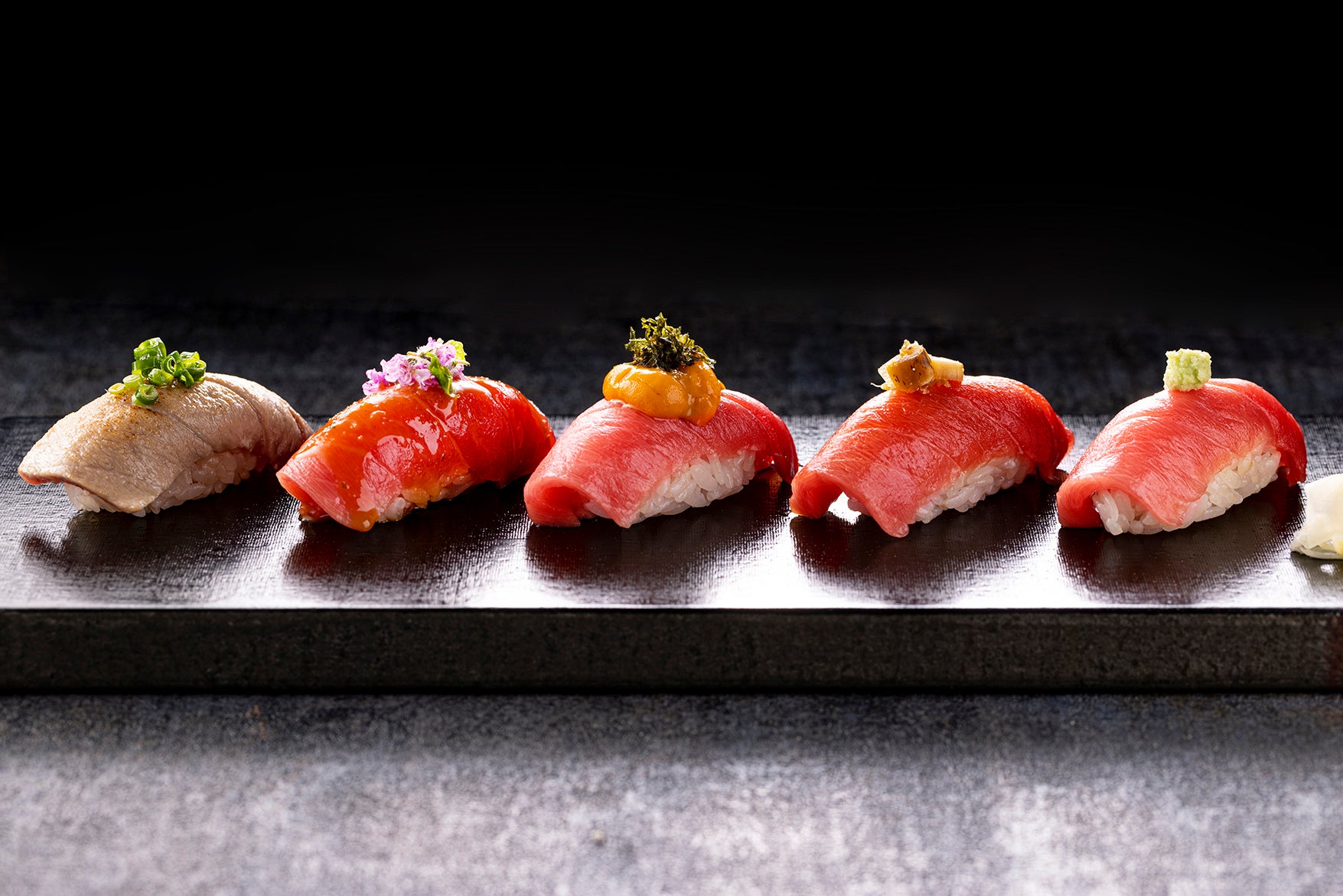 ・ サステナブル鮪の握り5種(炙り鮪、胡麻醤油鮪、鮪雲丹のせ、漬け鮪、鮪) 10,000円