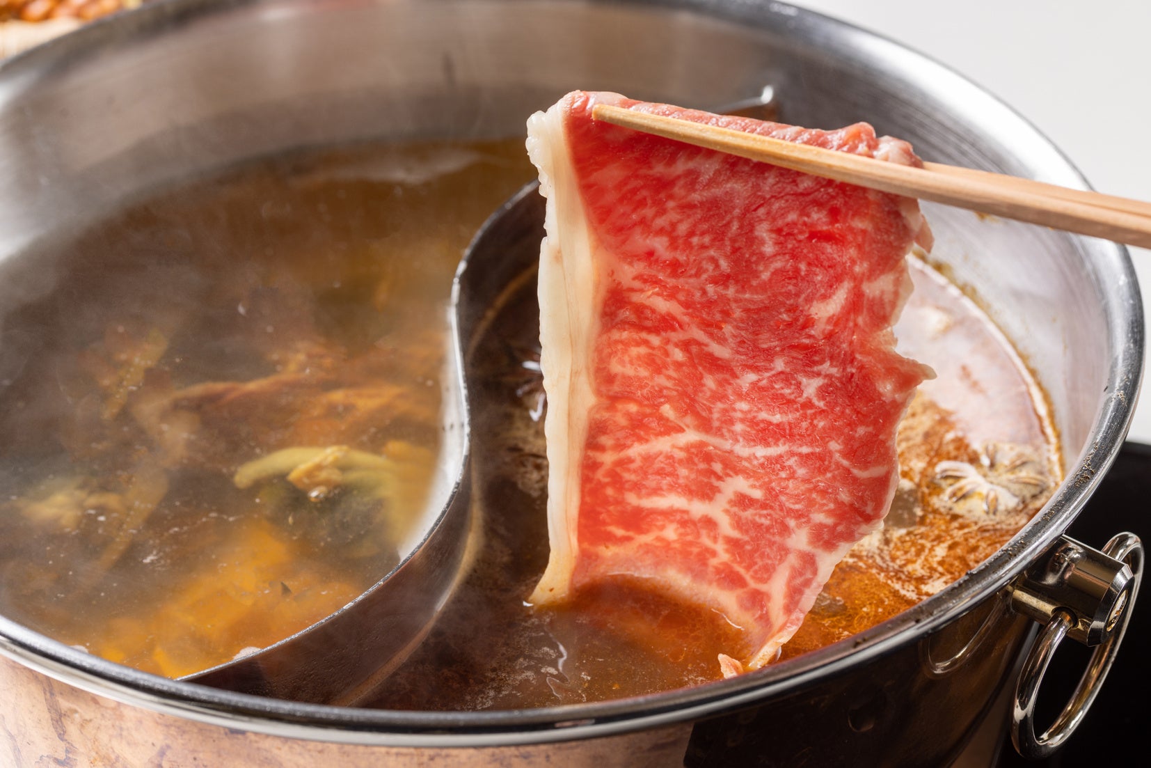今回使用するすっぽんは、日本で唯一産卵から養殖を手掛ける浦野淡水が育てたものをご用意しています。浦野淡水が自家栽培したカボチャとスイカを食べて育ったすっぽんは、他にはないぷりぷりとした食感と旨みが特徴。召し上がり方のポイントとして、どのような組み合わせでも美味しく食べられますが、すっぽんとスジアラは黄金スープ、十勝ハーブ牛と松阪豚は麻辣湯スープがおすすめです。また、はじめに少し野菜をスープに入れていただくと、旨みがスープに広がりまろやかな味わいをお楽しみいただけます。