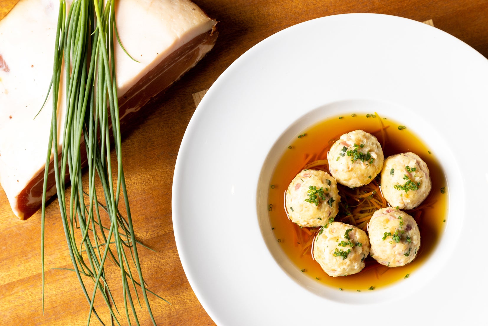 生ハムの一種であるスペックとパン、牛乳、卵を混ぜ合わせて茹でたふわっとした食感の団子のような一品です。西洋葱とニンジンの千切りを下に敷き、ビーフコンソメに浮かべて、見た目も可愛らしく仕上げました、スペックの香りとビーフコンソメが絶妙に合う、温まる一品です。