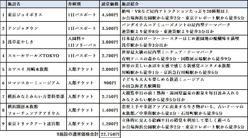 「東京ジョイポリス」、「ナンジャタウン」、「浅草花やしき」、「スモールワールズTOKYO」、「カワスイ 川崎水族館」、「ロマンスカーミュージアム」、「横浜みなとみらい万葉倶楽部」、「横浜開運水族館 フォーチュンアクアリウム」、「東京トリックアート迷宮館」