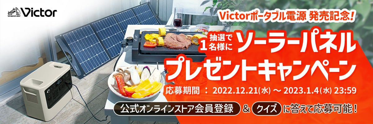株式会社JVCケンウッドは、Victorブランド初となるポータブル電源「BN-RF1500」「BN-RF1100」、およびポータブルソーラーパネル「BH-SV180」の発売を記念して、公式オンラインストア「JVCケンウッドストア」にて、「Victorポータブル電源発売記念! プレゼントキャンペーン」を実施します。限定1名様にポータブルソーラーパネル「BH-SV180」をプレゼント。キャンペーン応募期間は、2022年12月21日(水)~2023年1月4日(木)23:59まで。災害時はもちろん、日常やキャンプでも大活躍の“新しい必需品”を、この機会にぜひご確認ください。