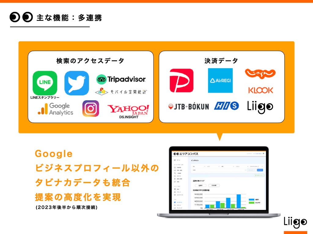 まずは、これまで培ってきたGoogleマップ(ビジネスプロフィール)データを元に、これら3つの基本機能を盛り込み、提供開始します。今年2023年後半から、+α (ex. 他サイトの口コミ / 決済 / 混雑 / 天候など)のデータを追加し、自治体に向けたエリア分析、並びに観光事業者に向けた売上アップのためのマーケティング提案機能を強化予定です。