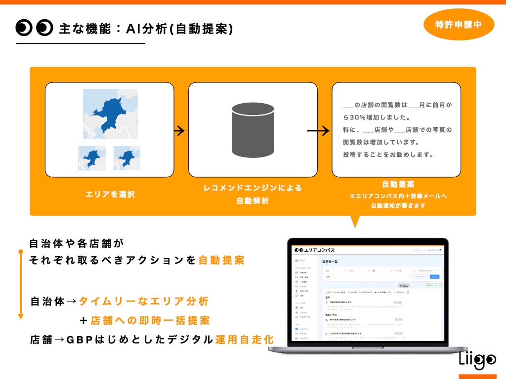弊社は、これまで旅行予約サイト「Liigo(リーゴ)」を運営するスタートアップでしたが、新型コロナウイルス流行の影響を強く受けて以降、一時は会社存続の危機に陥りました。旅行市場全体も大きな変化に直面する中、新たなチャンスとしてGoogleマップ(ビジネスプロフィール)の可能性を見出し、自治体や観光事業者向けにGoogleマップ(ビジネスプロフィール)活用を提案・推進し、再起と急成長を果たしてきています。現在、全国を対象に、約30自治体でプロジェクトを推進中で、数千店舗の観光事業者の支援をしています。また、Googleマップ(ビジネスプロフィール)データを活用し、自治体や観光事業者が地域の見える化や連携を実現できるプラットフォーム「エリアコンパス」を開発。限定約10自治体へβ版を提供し、ユーザーヒアリングを行ってきました。この度、コア機能が揃ったことから「エリアコンパス」を正式リリースいたします。