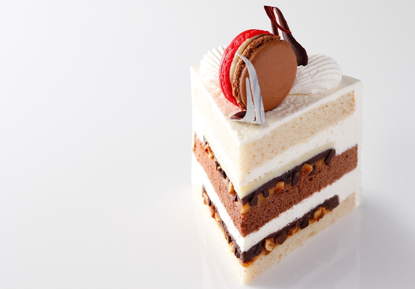 柔らかな酸味と豊かなフレーバーが特徴のコロンビア産サンタンデールのチョコレートを主役に、スポンジ生地をつなぐチョコレートカスタードクリームには、キャラメリゼしたヘーゼルナッツとアーモンド、ラムレーズンや長崎県産の藻塩を使用。さらにチョコレートと相性抜群なアーモンド塩キャラメルのカスタードクリームをプラスすることで、キャラメルのコクとほのかな塩味が後を引く美味しさを演出しました。見た目は生クリームをまとったショートケーキ、でも中身は本格的なチョコレートケーキをお愉しみください。