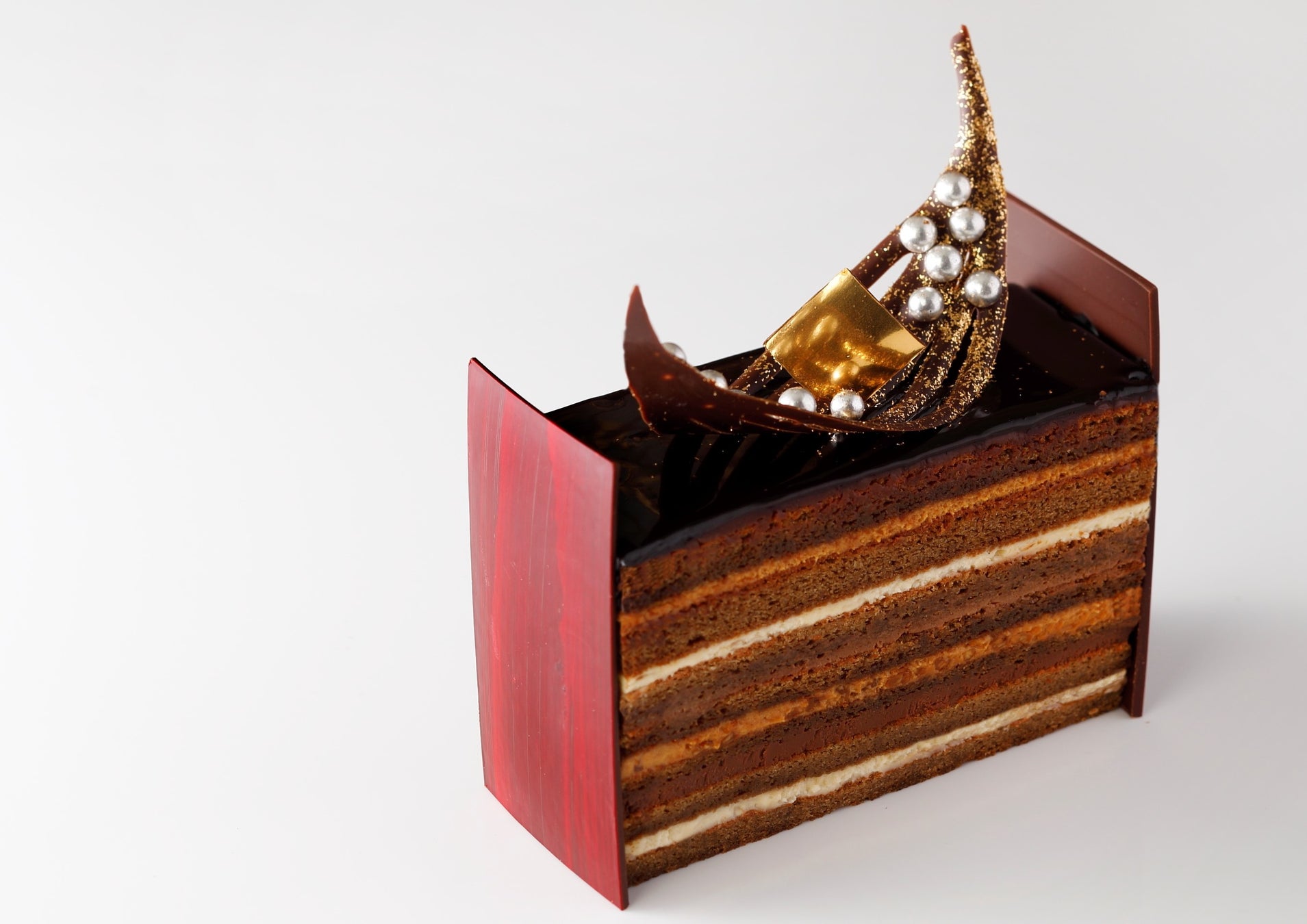 華やかなデコレーションが印象的なチョコレートケーキ。高さ8.5cmのその生地は14層にも成り、その1層1層には、厚みや食材を変えて極上の味を演出しています。2種類のガナッシュと、2種類のバタークリームを深い味わいのエスプレッソを含ませた7層のビスキュイで挟み、中にはカラメリゼしたアーモンドをアクセントに加えた「至極の逸品」です。