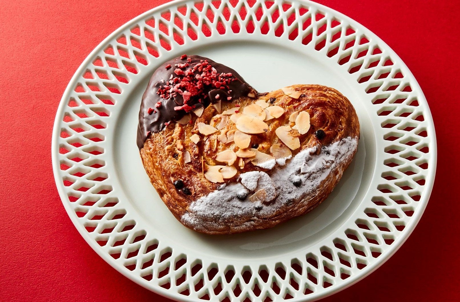 ハートをかたどったパイは、生地にチョコチップやアーモンドクリームを使用し、仕上げにチョコレートと「博多あまおう」のフリーズドライをトッピング。