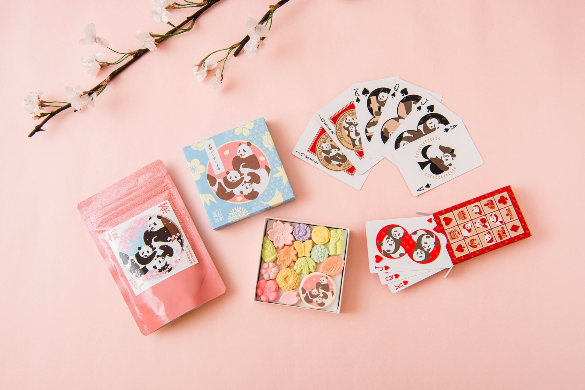 子供から大人までみんなで楽しめる上野パンダファミリーデザインのトランプをはじめ、上野の四季にまつわるモチーフとパンダデザインを詰め合わせた和菓子、また毎年人気の国産の桜葉にこだわった桜茶など、上野案内所オリジナル商品が続々登場!