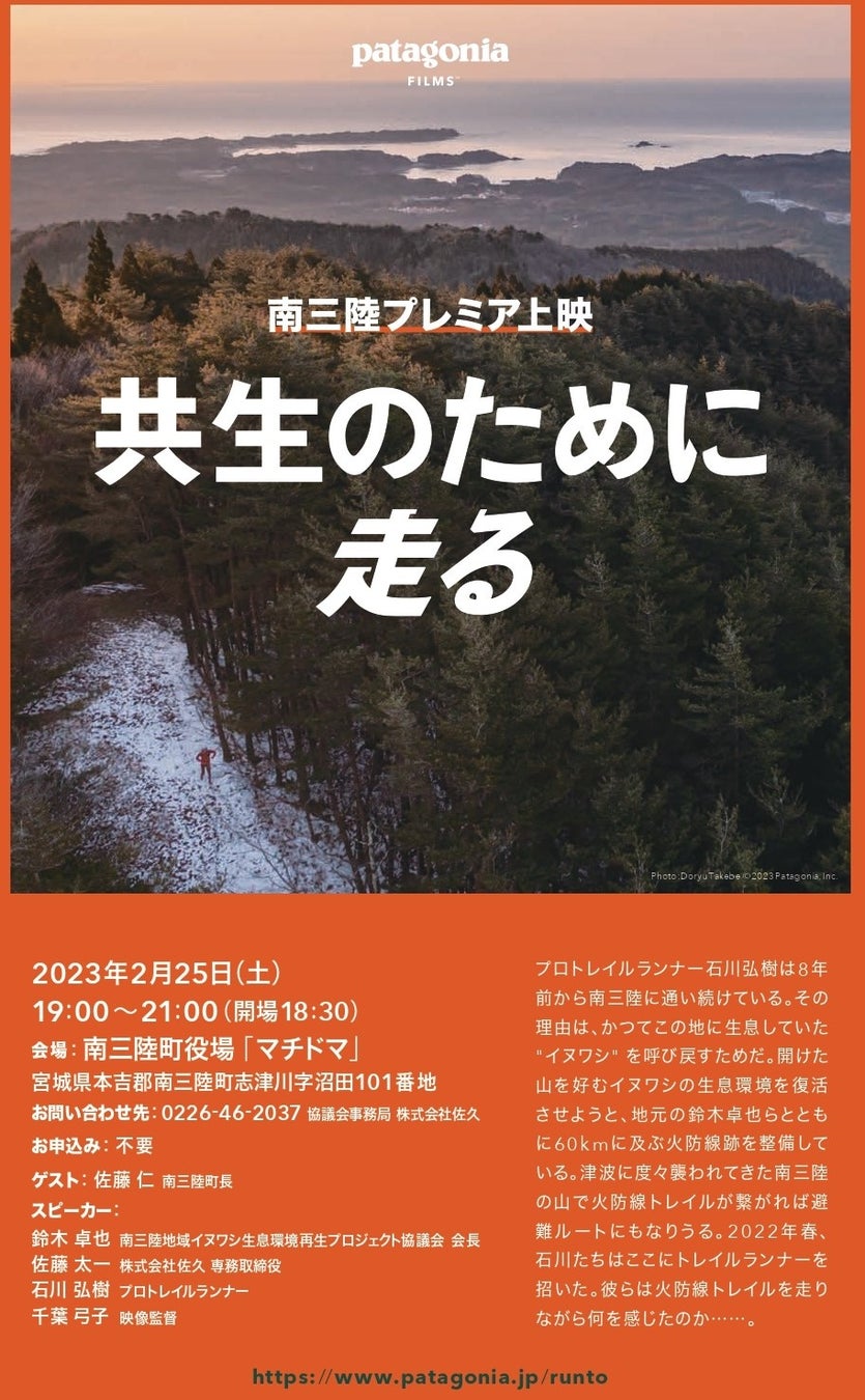 2月25日(土)19:00より、宮城県南三陸町を舞台としたフィルム「共生のために走る」(パタゴニア日本支社主催)のプレミア上映会を開催します。