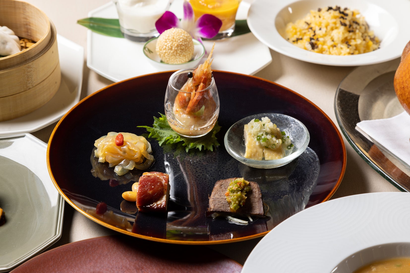 中国各地の代表的な料理や本格的な飲茶をお召し上がりいただける中国料理「チャイナルーム」では、本場香港仕込みの点心やオーセンティックな中国料理を、アワビやトリュフ、上海蟹や燕の巣などの高級食材でアップデートした、祝祭感あふれるコースを用意しました。ランチメニューでも人気の点心から登場するのは、焼売とホタテの蒸し餃子。20周年は特別に、焼売には鮑をのせ、蒸し餃子にはトリュフを加えることで、立ち上る湯気の豊潤な香りまでも楽しめる一皿に。平飼いで肉質の良いアヒルを、時間をかけて釜で焼き上げることで余分な脂を落とした名物の釜焼き北京ダックは、シェフがテーブルでカットし仕上げるライブ感も楽しい一品です。シャンパンを含むフリーフロードリンクとともにお楽しみください。