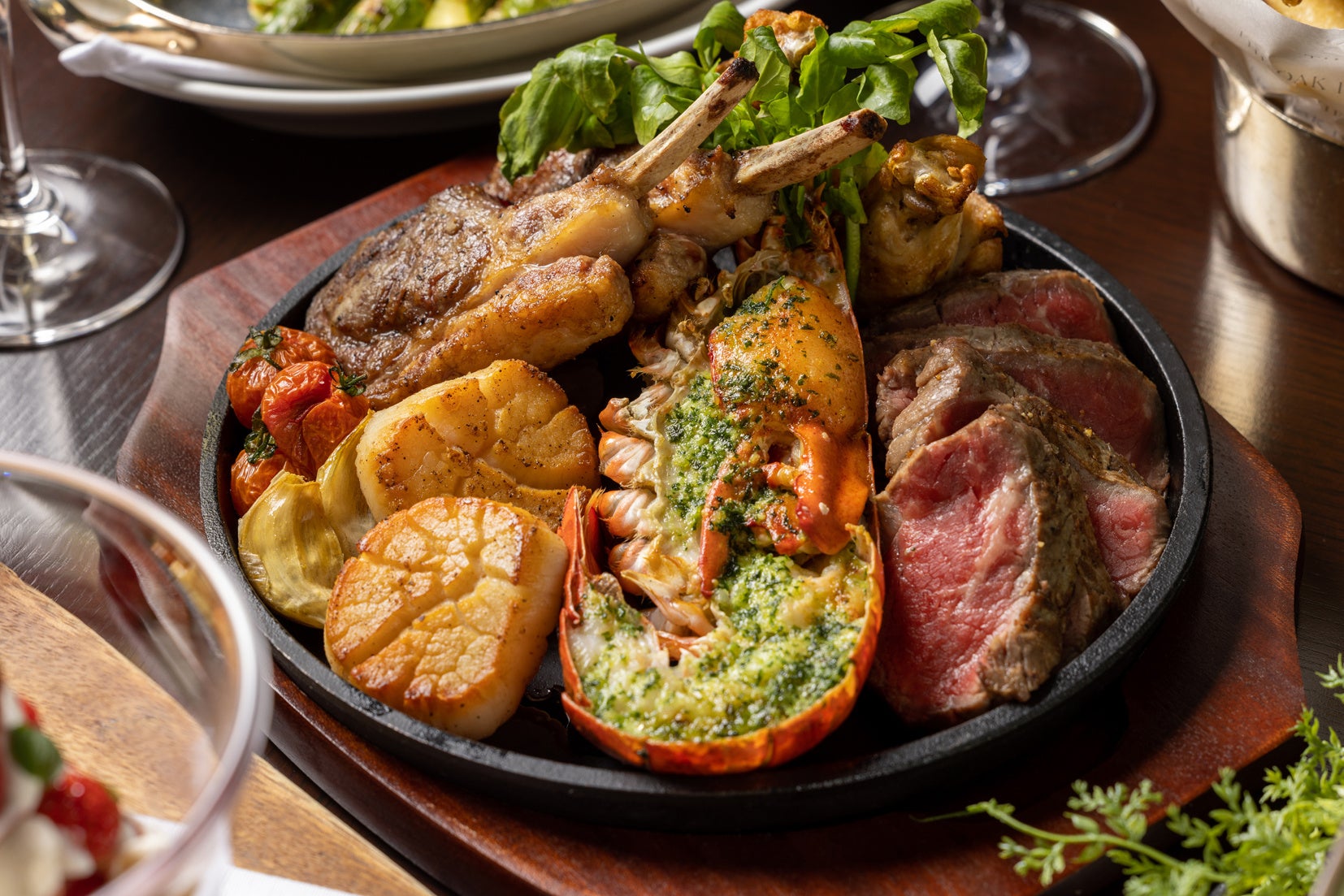 テーキハウスの人気メニューを一気に堪能できるテラスプランが登場。2名で20オンス(約600グラム)のステーキやロブスターが堪能できる豪華なサーフ&ターフのグリルプレートも!