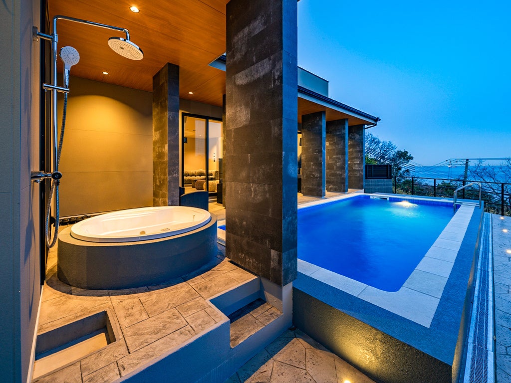 客室にはプライベートプール・専用サウナ・屋外ジャグジーを配置。
