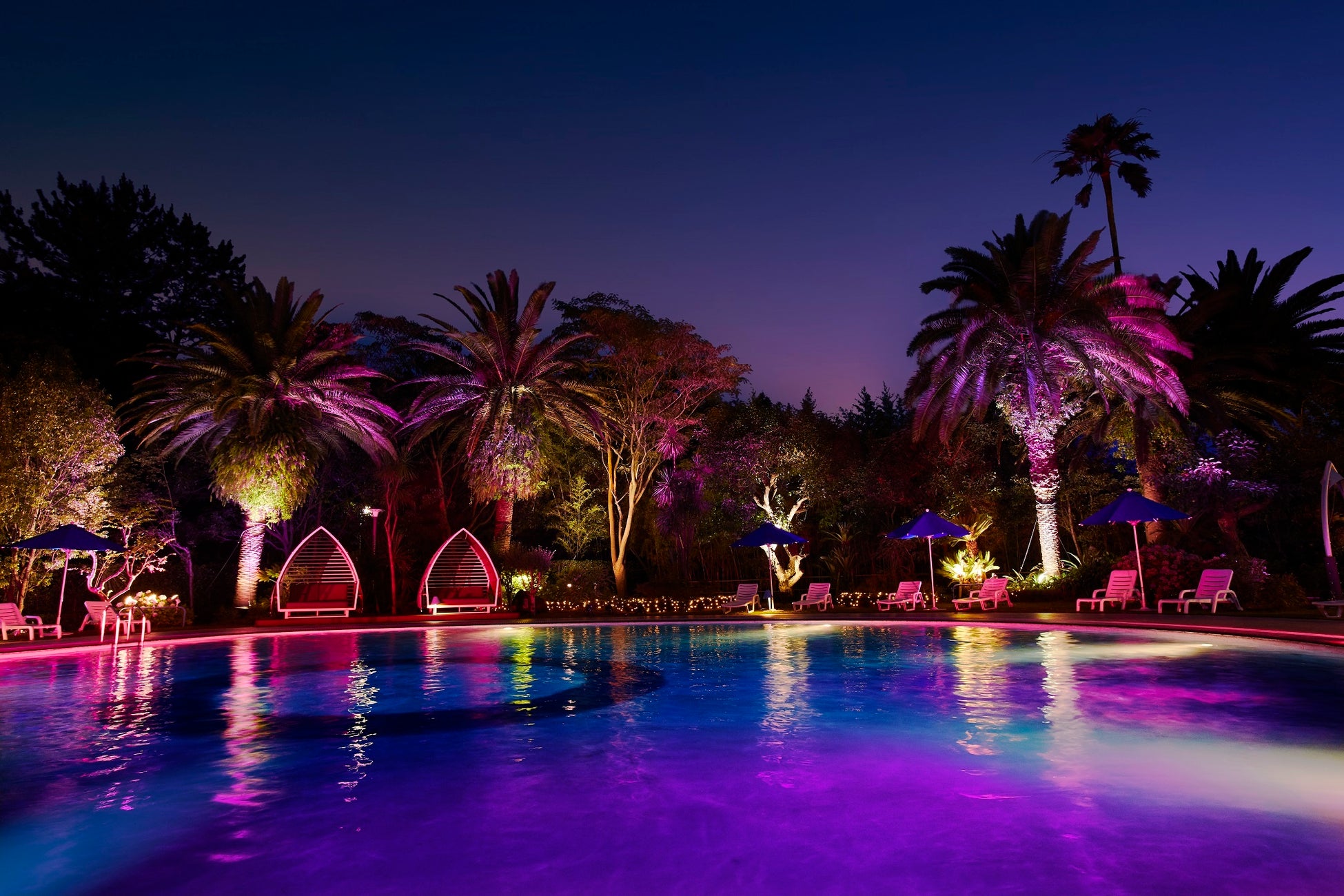 夕陽がプールの水面を染める頃、プールが大人の空間へと変貌いたします。ナチュラル系の照明が木々を照らして南国で夏休みを過ごしているような優雅な雰囲気のナイトプールですが、毎週金曜日のDJナイトには夕闇を幻想的に照らし出すピンク色のライトアップ でゲストをお迎えいたします。プールのいたるところが華やかにライトアップされているため、どこで写真を撮ってもSNS映え間違いなしです。