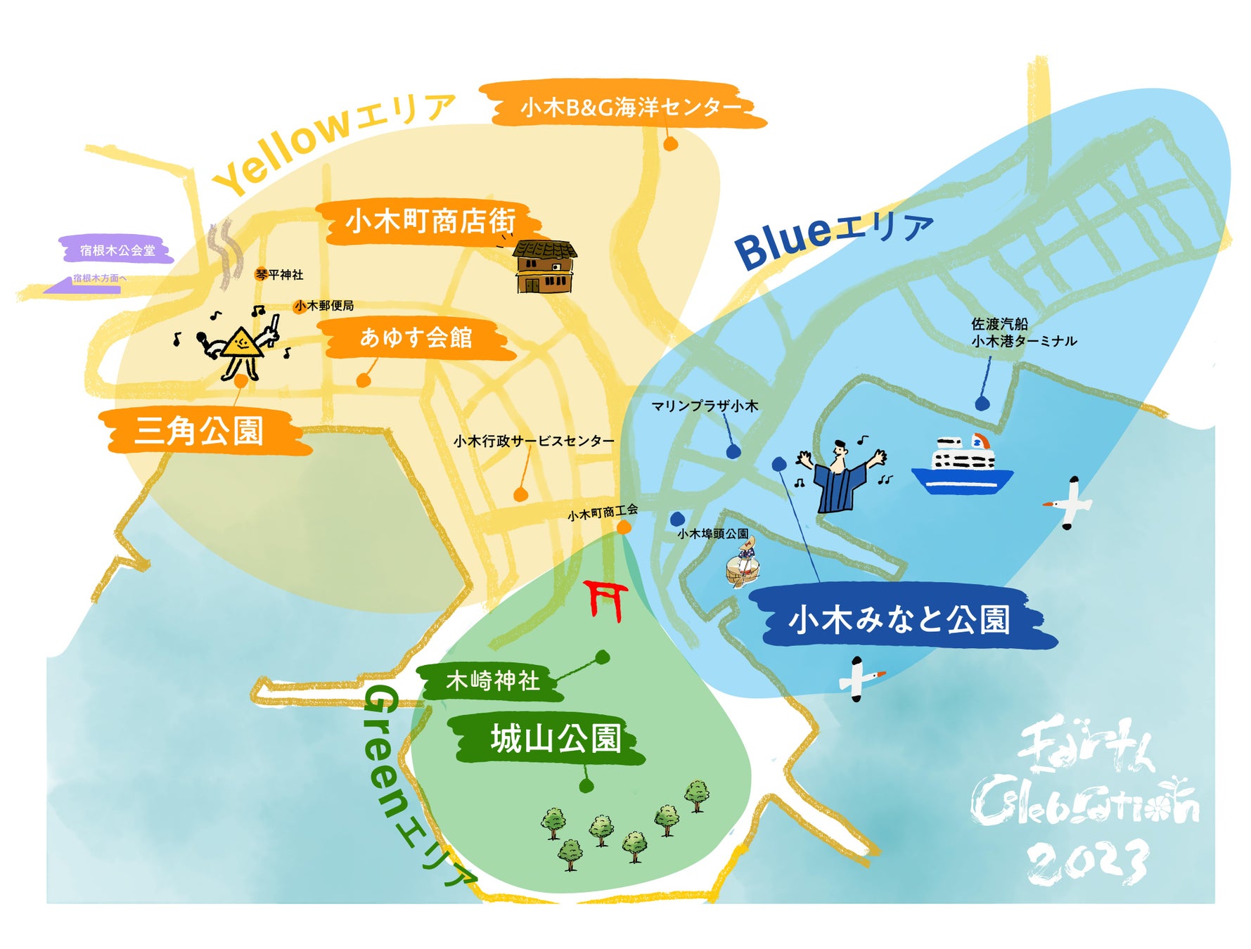 Yellowエリア=町民文化薫る商店街エリア(小木商店街/小木扇の市・三角フリンジ会場)