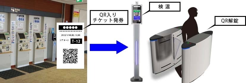 顔認証で会員登録、現地で認証後、発券機で任意のメニューやチケットを選択した後にQRを印字、ゲート解錠や商品の購入に使うともできます。