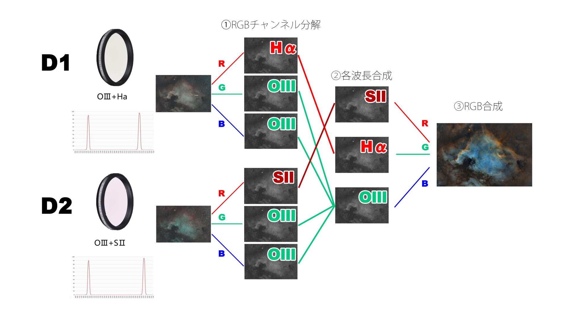 ・D1フィルターはHαとOIIIの輝線を透過し、D2フィルターはSIIとOIIIの輝線を透過します。