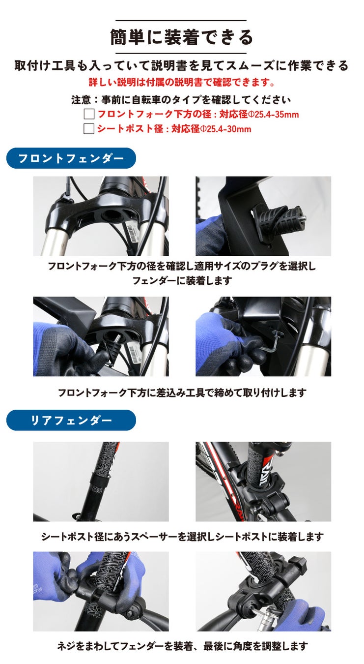 幅広いのでタイヤの太いMTBマウンテンバイクに最適な自転車用泥よけです。