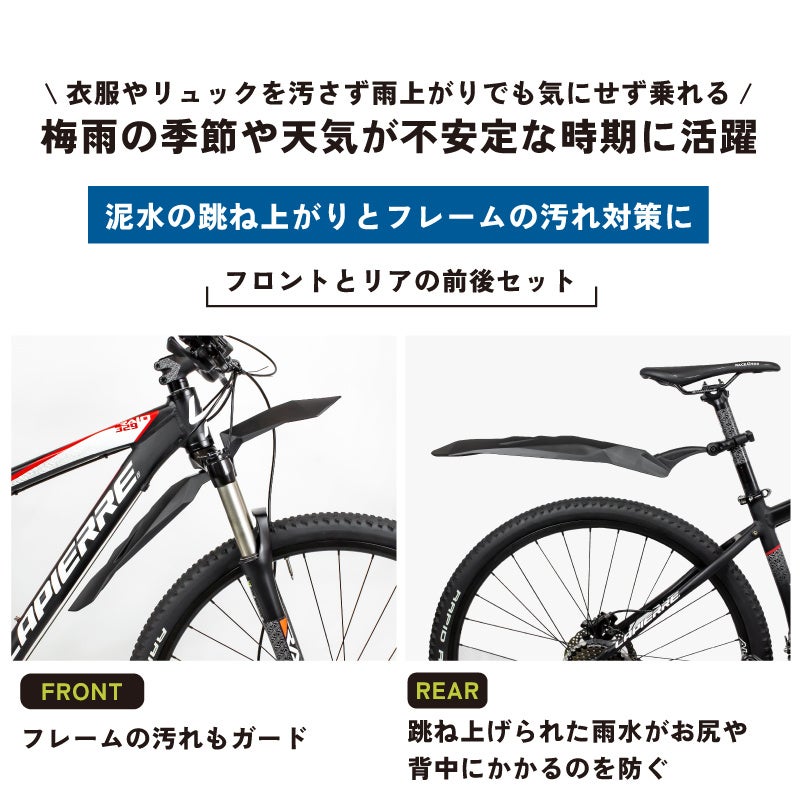 服やリュック、背中など汚れるのを防ぎ雨上がりでも安心して自転車に乗れるようになります。