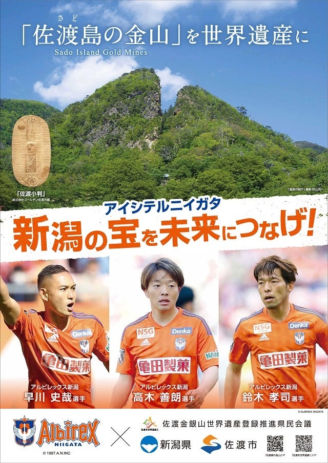 このたび、アルビレックス新潟のホームタウン佐渡市が誇る「佐渡島の金山」の世界文化遺産登録の実現と、将来に渡る価値の継承に向けた機運醸成を図るため、早川史哉選手、高木善朗選手、鈴木孝司選手をモデルに起用いただいたポスターが完成しましたので、お知らせいたします。