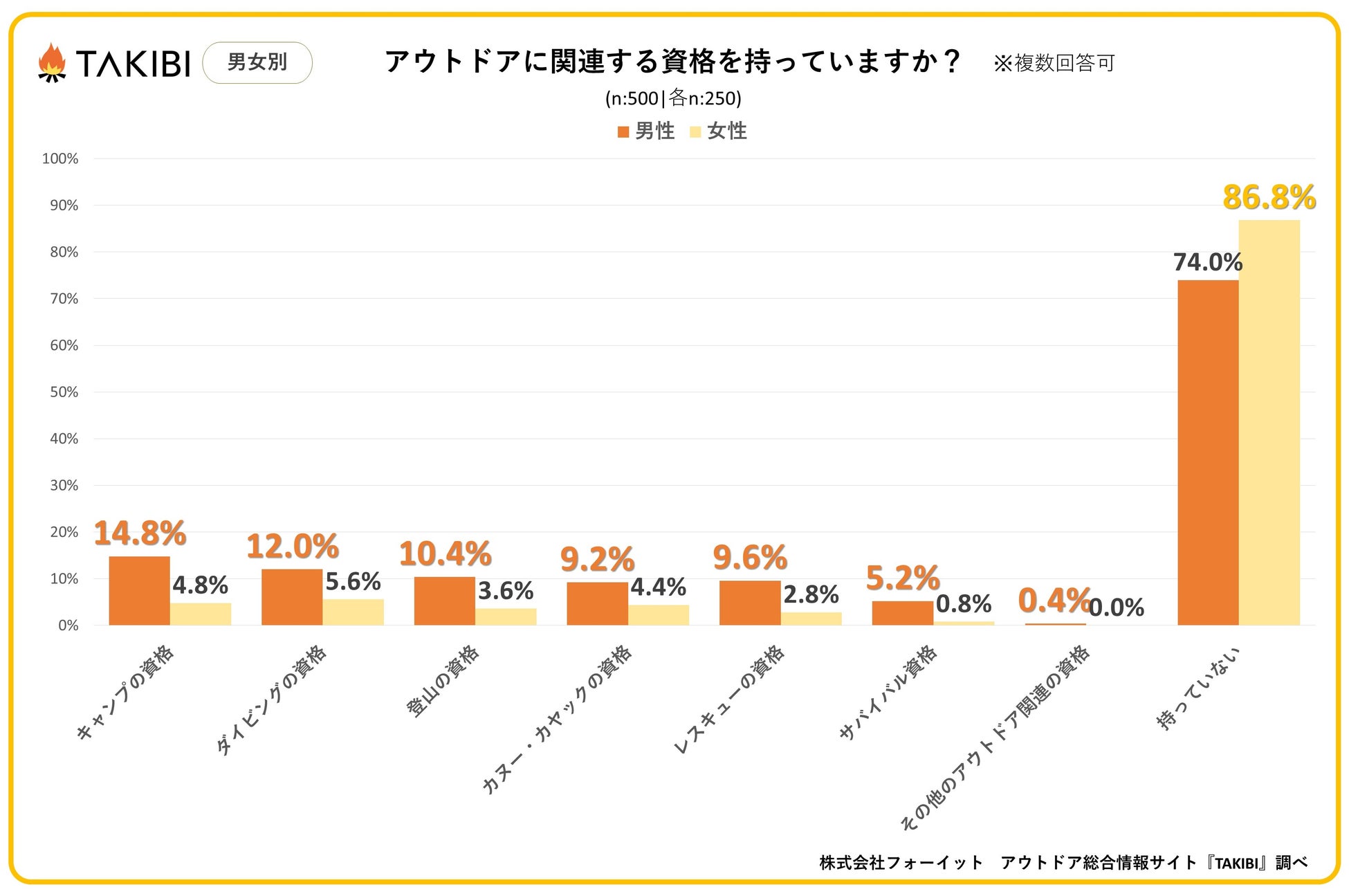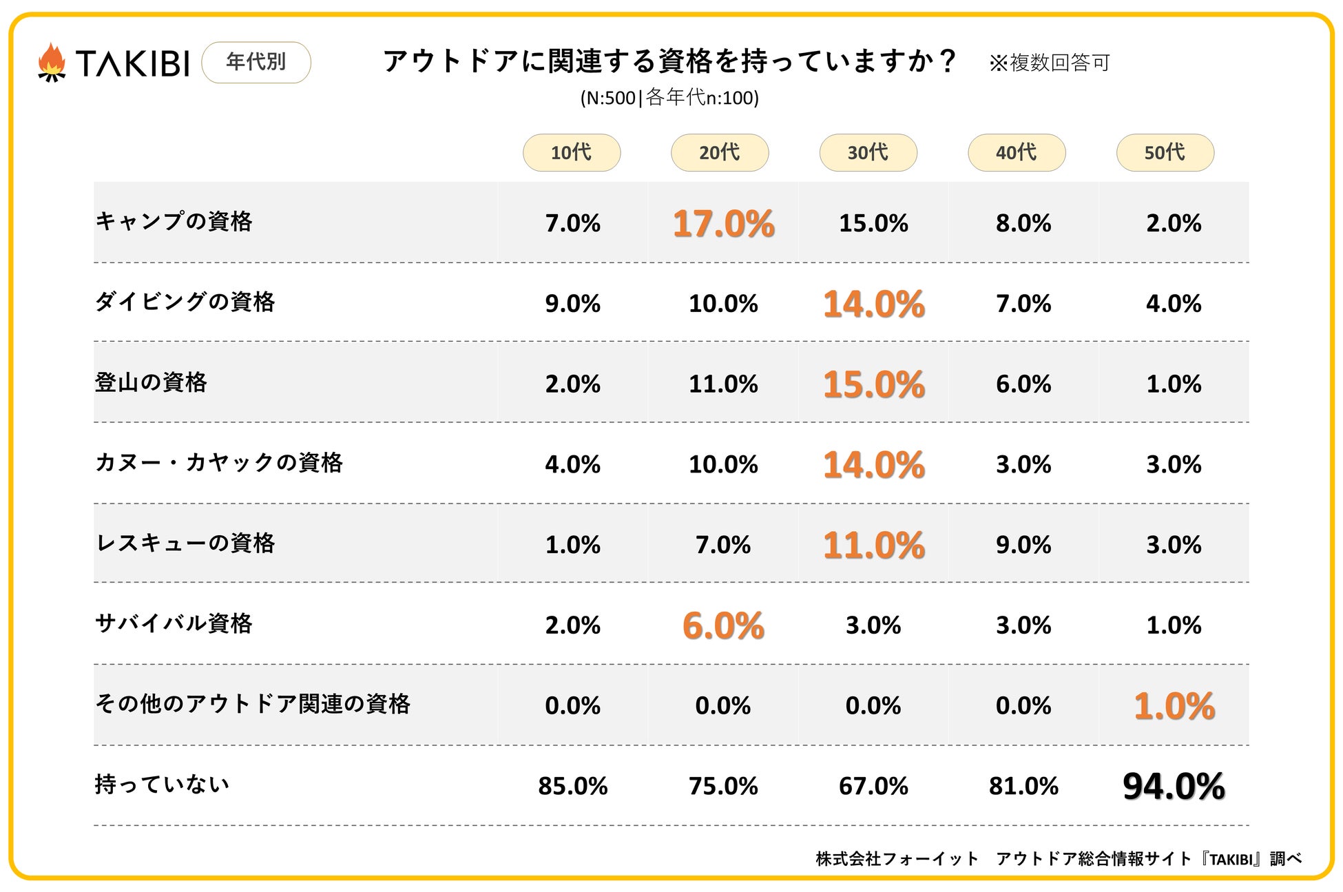 キャンプやグランピングを中心としたアウトドア総合情報サイト「TAKIBI」の運営をおこなう株式会社フォーイットは、全国の10代~50代までの男女500人を対象にアウトドア関連の資格に関するアンケートを実施し、男女別・年代別等の特徴についてまとめました。