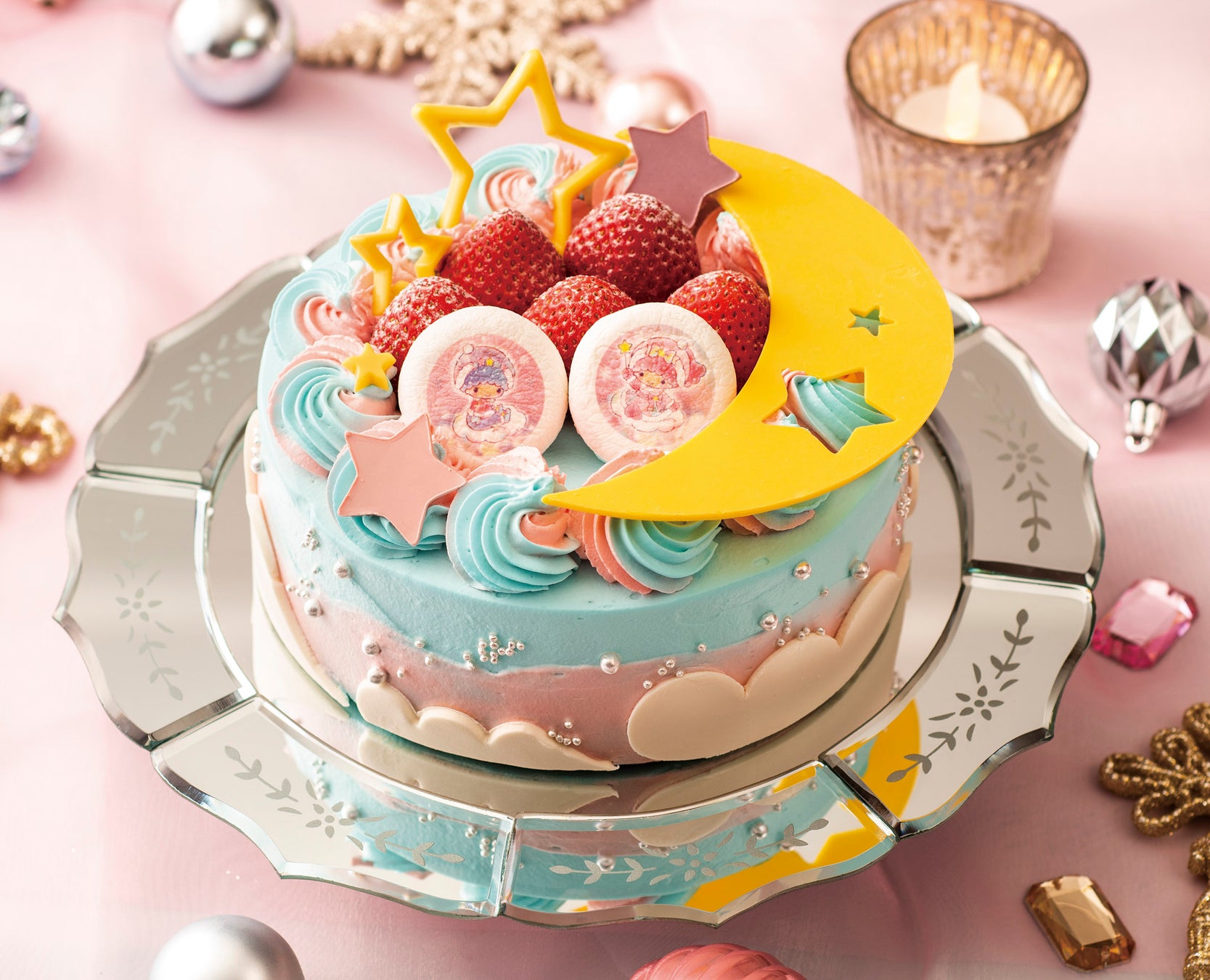 パティシエが細部までこだわり、作り上げたキキ&ララのクリスマスケーキには、チョコレートでかたどった大きな三日月や星を飾り、キャラクターのイメージしたカラーとしてピンクとブルーの二色のクリームを絞り、センターにはキキ&ララが描かれたマシュマロを飾りました。ケーキの中は、しっとり焼き上げたスポンジ生地に口当たり軽やかな生クリームとスライス苺を挟みました。キキ&ララの可愛さ溢れる世界観を楽しみながらご家族・ご友人と特別なクリスマスをお過ごしください。