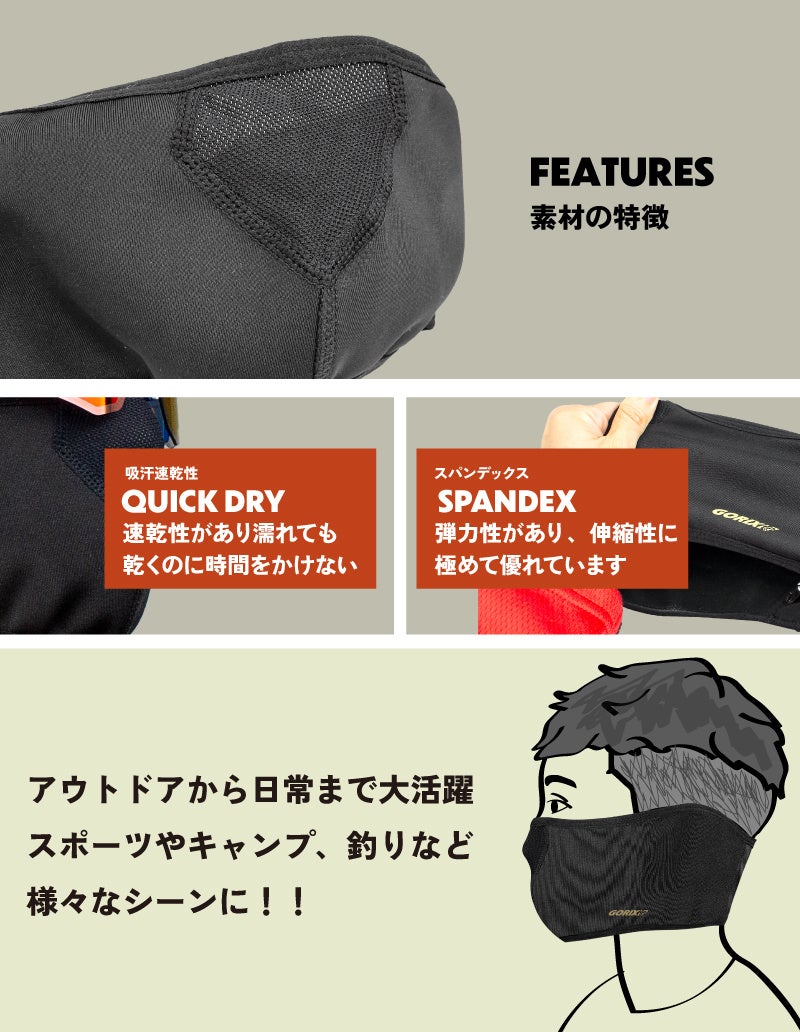顔を出して野外活動をする際、冷たい雨風から顔をガードする防寒スポーツマスクです。