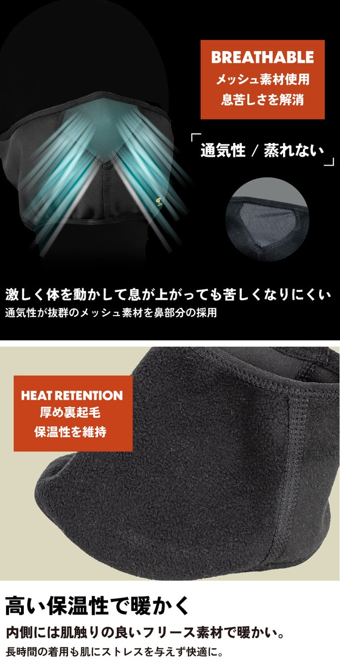 耳に掛けない・耳まで暖かい冬用スポーツマスクです。