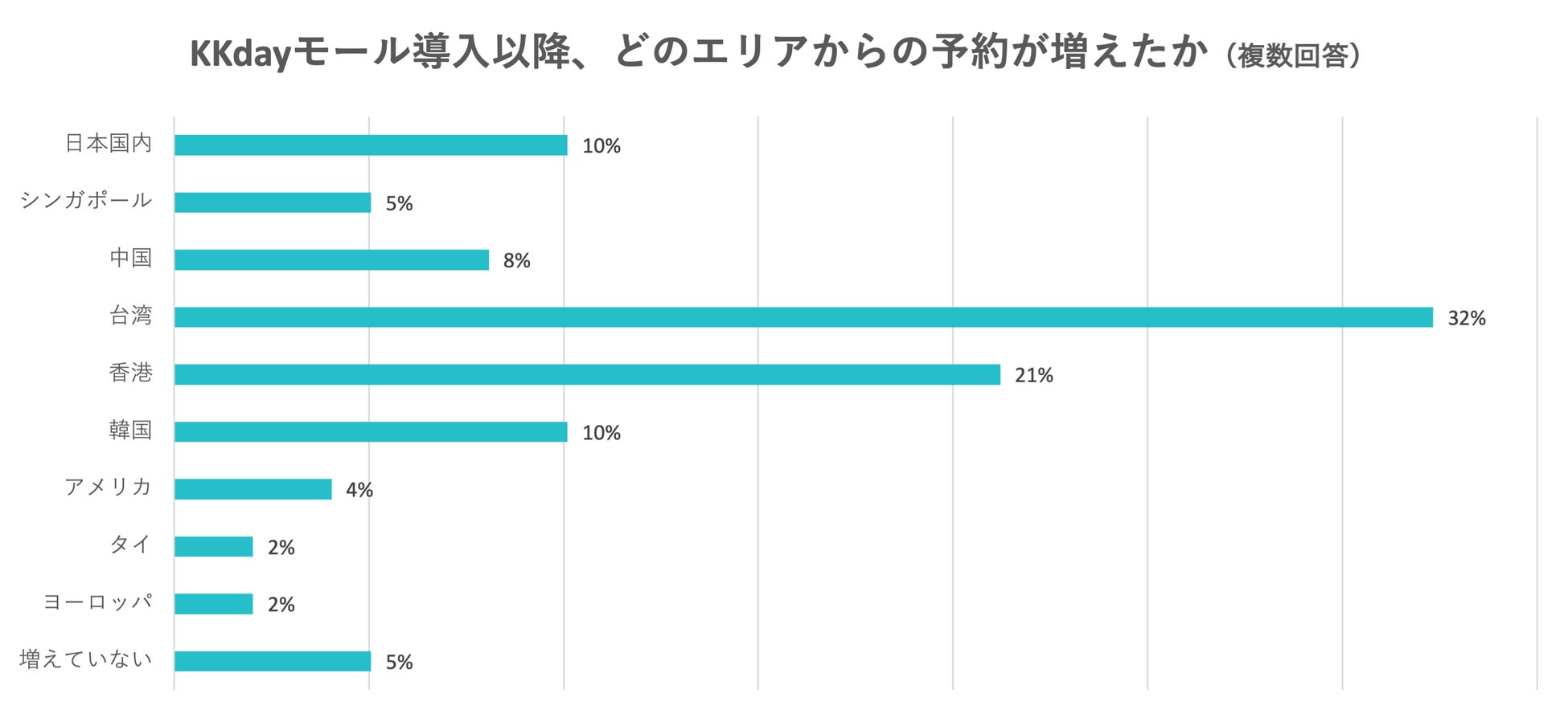 これらのエリアは、日本政府観光局が発表している訪日旅行数でも上位を占め、またKKdayグループは、それらのエリアに対する集客に強みを持っていることもあり、これらのエリアからの予約が図化したと実感している事業者が多くなっています。