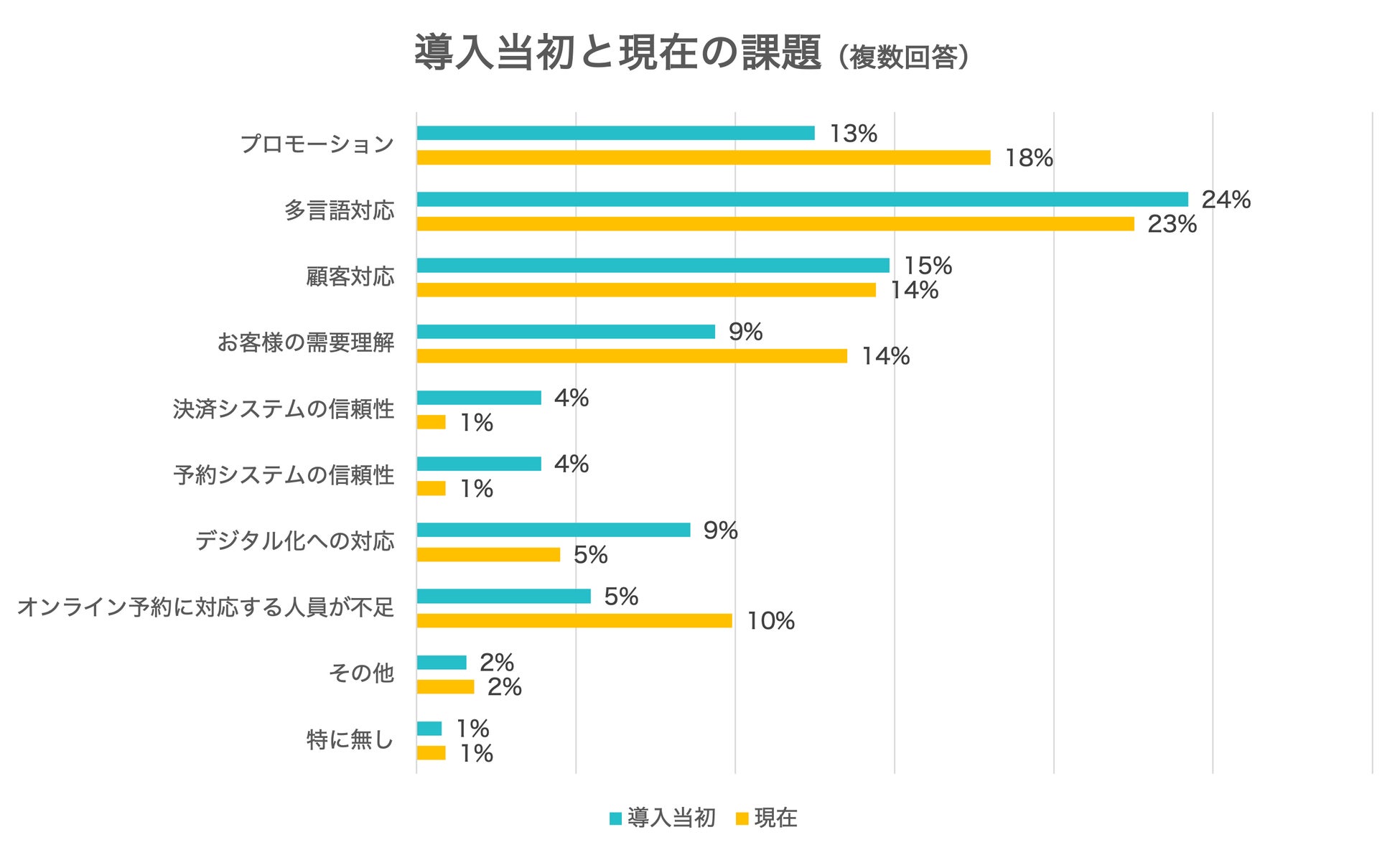 導入当初は、「多言語対応」「デジタル化への対応」「決済/予約システムの信頼性」が課題として挙げられ、インバウンド向けにオンライン予約を導入する上でのシステムやページへの不安感が大きいようでした。