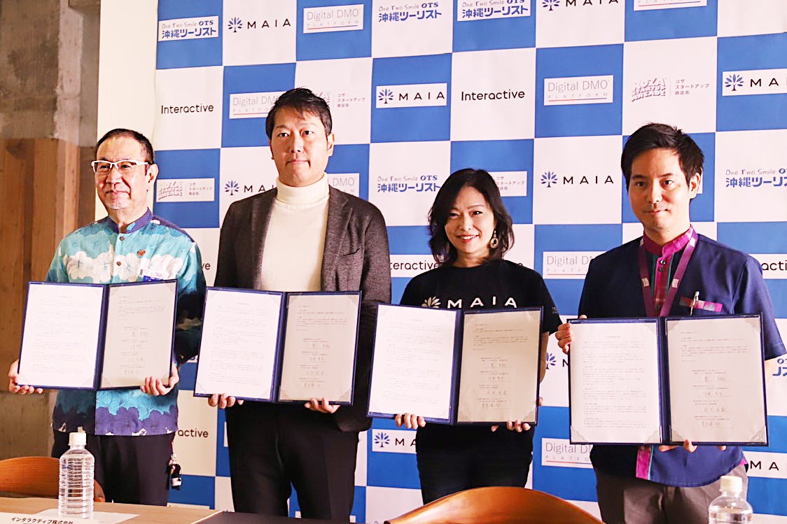 (X-BORDER KOZA内にて、写真左から、沖縄ツーリスト株式会社 代表取締役 会長 東 良和、インタラクティブ株式会社 代表取締役社長 臼井 隆秀、株式会社MAIA 代表取締役 月田 有香、株式会社Link and Vidible 代表取締役CEO 豊里 健一郎)