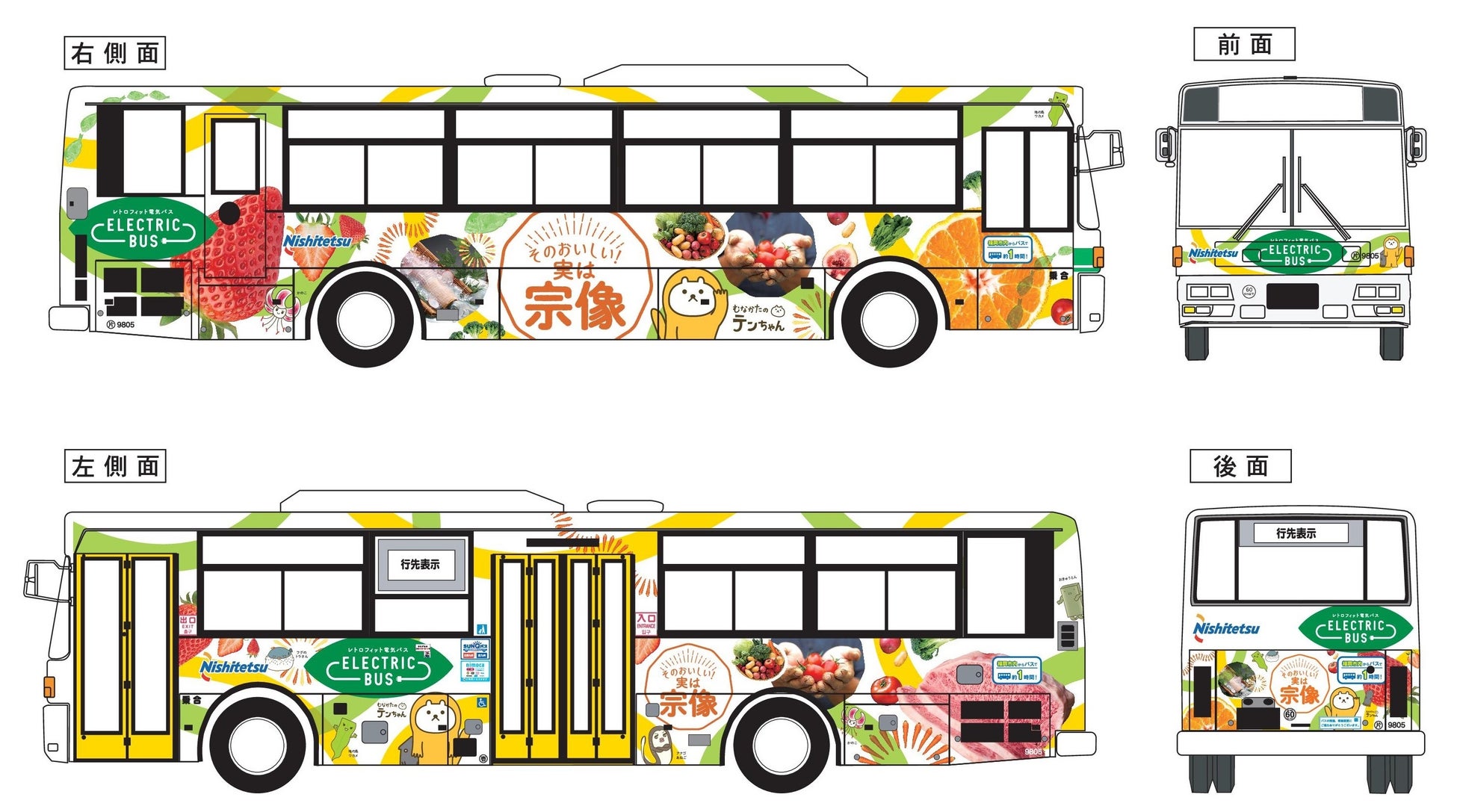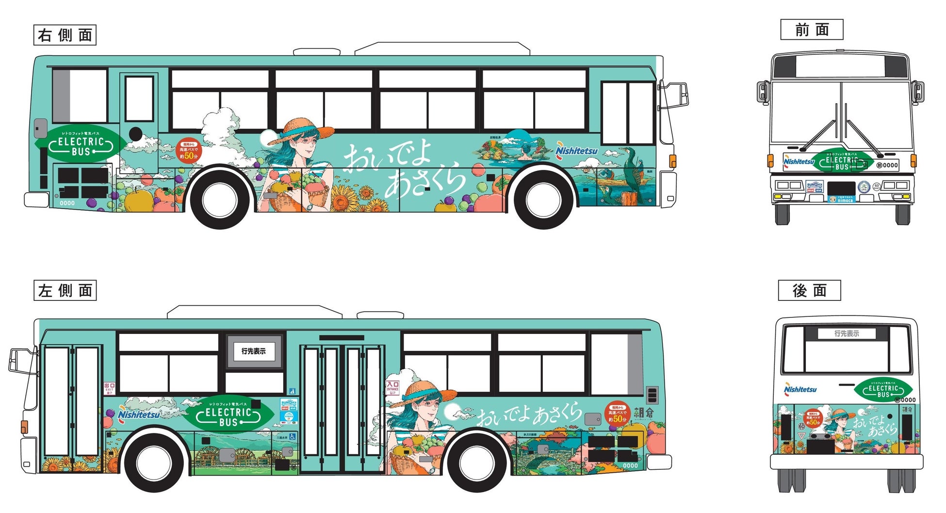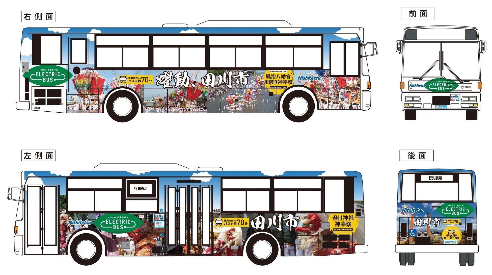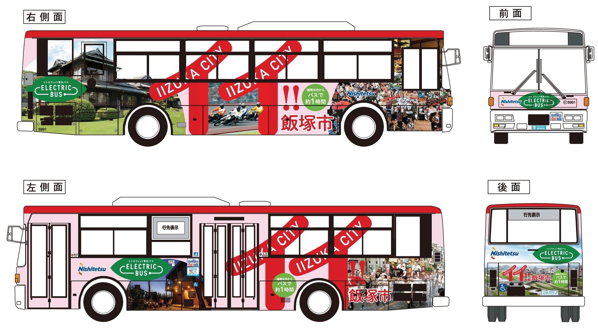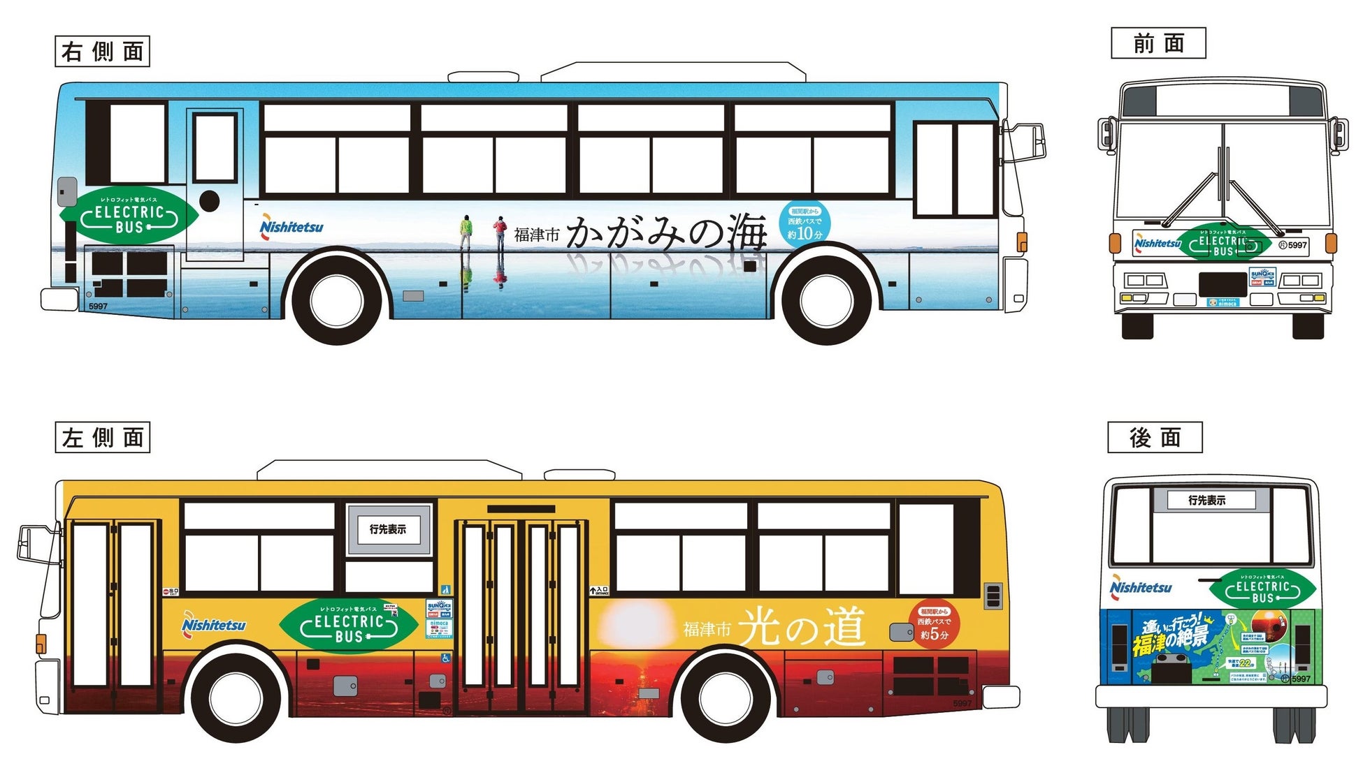 西鉄グループでは、“レトロフィット電気バス”(西鉄車体技術㈱製造)を14台追加導入し、2月13日より順次運行を開始いたします。この車両には、福岡県および山口県下関市11の自治体・企業・団体の観光名所や名産品をデザインしたラッピングを施します。