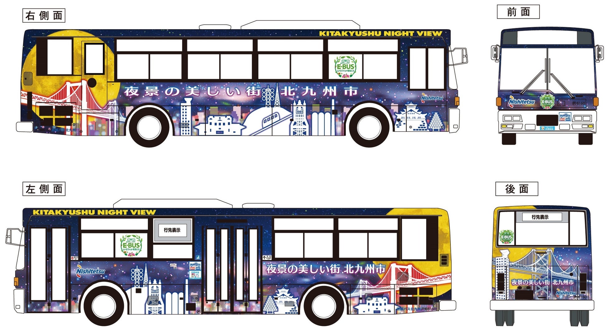 北九州市内のランドマークを配置し、夜景の美しさを柔らかな雰囲気をデザイン。バス後部は、下関市のバスと並べると関門海峡のシルエットが繋がることで関門連携を表現。