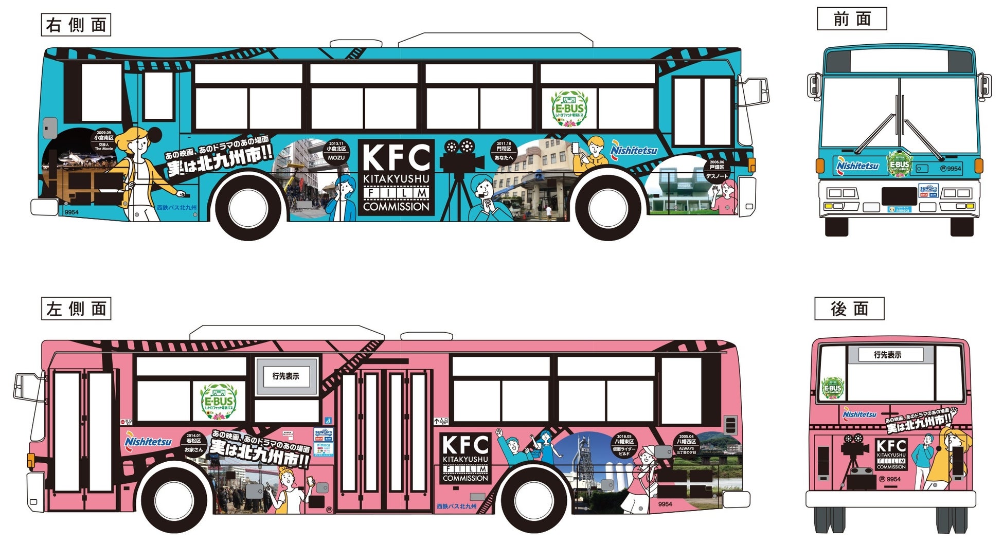 多くの映画ロケが北九州の街で行われている事を、幅広い世代に知ってもらうため、目を引くポップなカラーとイラストの中にロケ地の写真を配置。ロケ地巡りのきっかけとなる車両デザイン。
