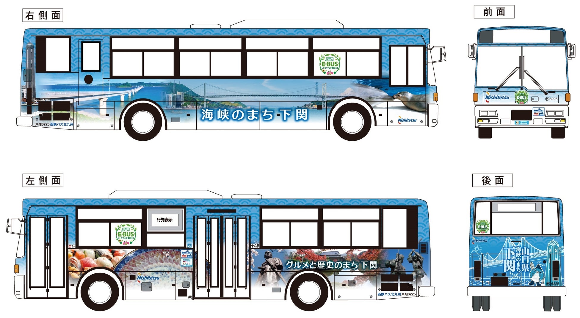 海の美しさや透明感の青をベースに、下関の観光名所や特産物を写真で配置。バス後部は、北九州市のバスと並べると関門海峡のシルエットが繋がることで関門連携を表現。