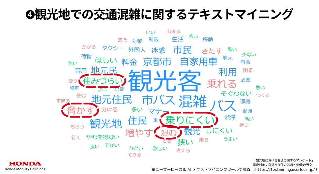 「住みづらい」「乗りにくい」「混む」というネガティブなキーワードが多くあり、また「住民」「地元住民」など京都市民の主語も目立ちます。京都市民が、観光客へ交通に関してネガティブなイメージを抱いていることが推察できます。一方で、「増やす」「つくる」などの改善に繋がるキーワードも見えることから、観光客と地元民の双方が、快適に移動ができる方法を模索していきたい考えも垣間見えます。