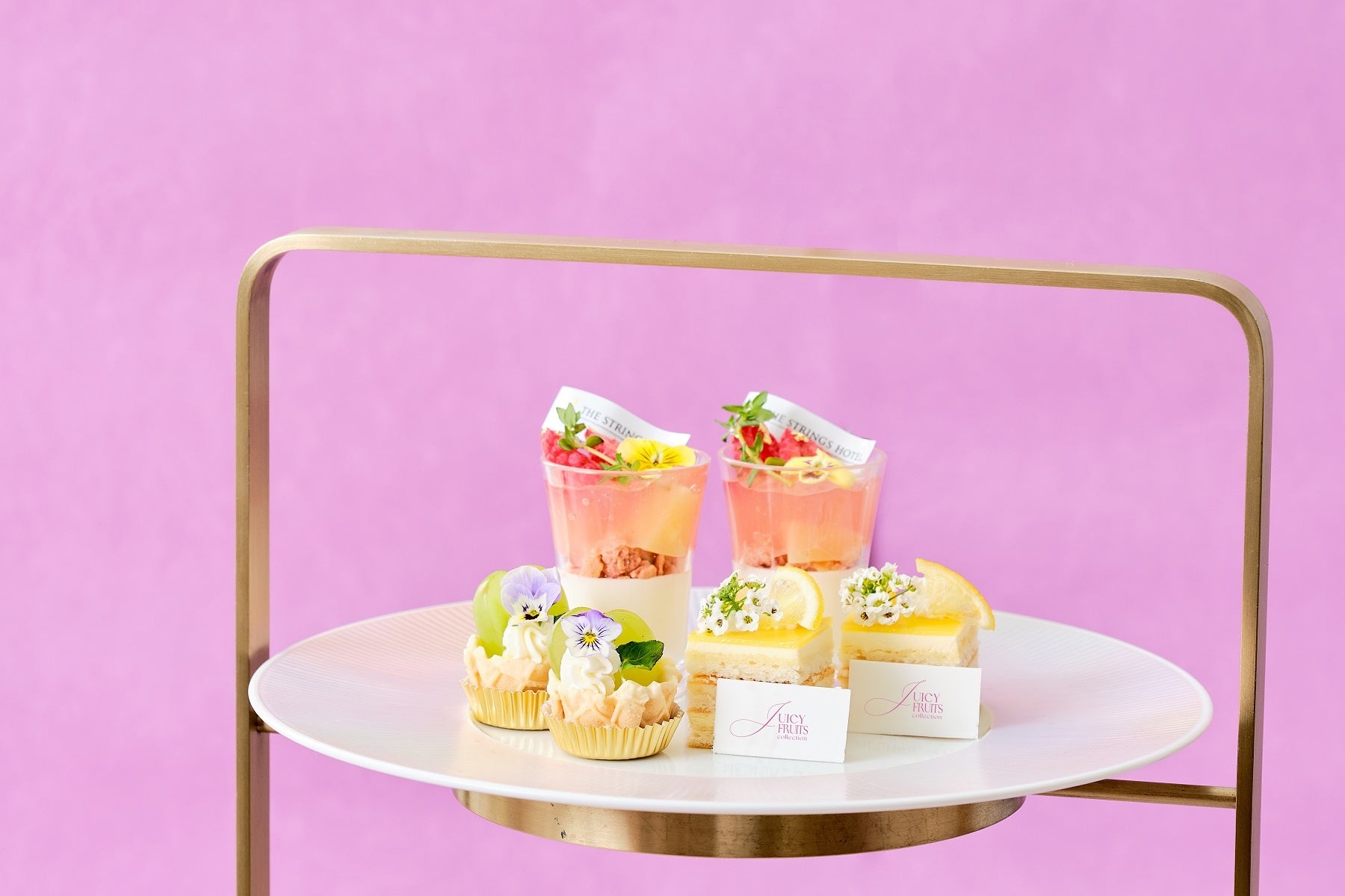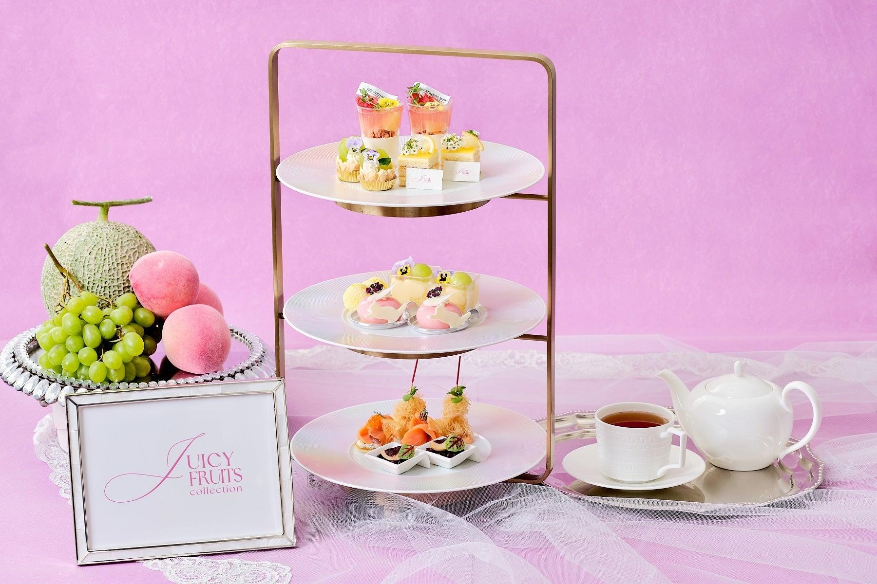 スイーツは、みずみずしいシャインマスカットをふんだんに使用したタルトや、白桃の果実とジュレをアーモンドのブランマンジェに重ねて仕上げた優美なひんやりスイーツ、フレッシュメロンの贅沢トライフル、レモンバタークリームとレモンガナッシュをサンドした爽やかなガトーオペラ、薔薇の風味を効かせた桃とラズベリーのムースなど初夏を感じられる色合いと味わいが調和した6種をご用意。特製セイボリーには、スモークサーモンにケッパーを効かせたサワークリームとフレンチキャビアのブリ二や、ぷりぷりの小エビのカダイフ巻き、トリュフが香るマッシュルームリゾットのコロッケ仕立て、彩り豊かな5種野菜のスパニッシュオムレツなど計6種類をご堪能いただけます。
