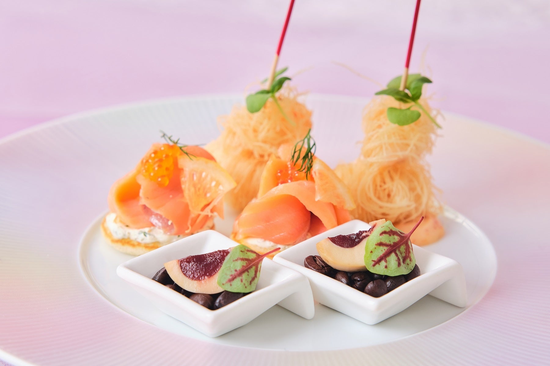 (下段)フォアグラとアマレーナチェリーのムース コーヒー風味/スモークサーモンとフレンチキャビアのブリニ/小エビのカダイフ巻き