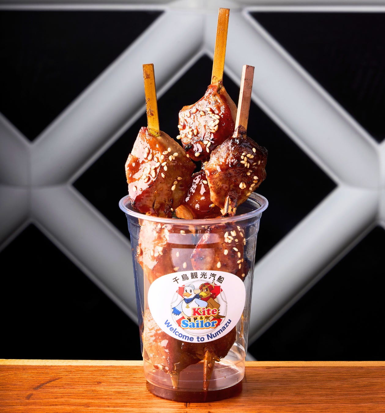 沼津市場仲買人と千鳥観光汽船料理長秋山ががタッグを組んで厳選している「まぐろ」を地元西浦みかん入りの自家製にんにく醤油につけて炙った【まぐろ串】