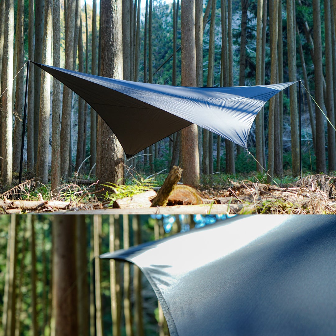 TokyoCampが開発した防炎加工済みの生地FENICを採用しており、難燃性に優れ、焚き火の安全性を強化しています。生地の耐水圧は8,000mm、縫い目の裏側に止水テープを配し、大雨でも雨漏りしません。UVカットコーティングを施し、炎天下の日差しでも快適で安心です。