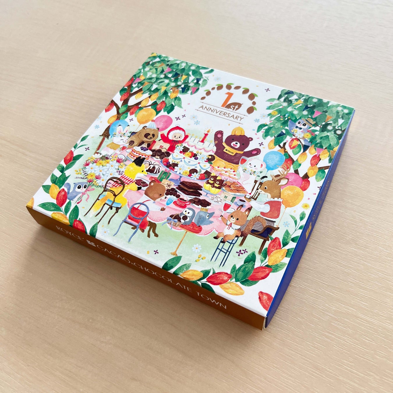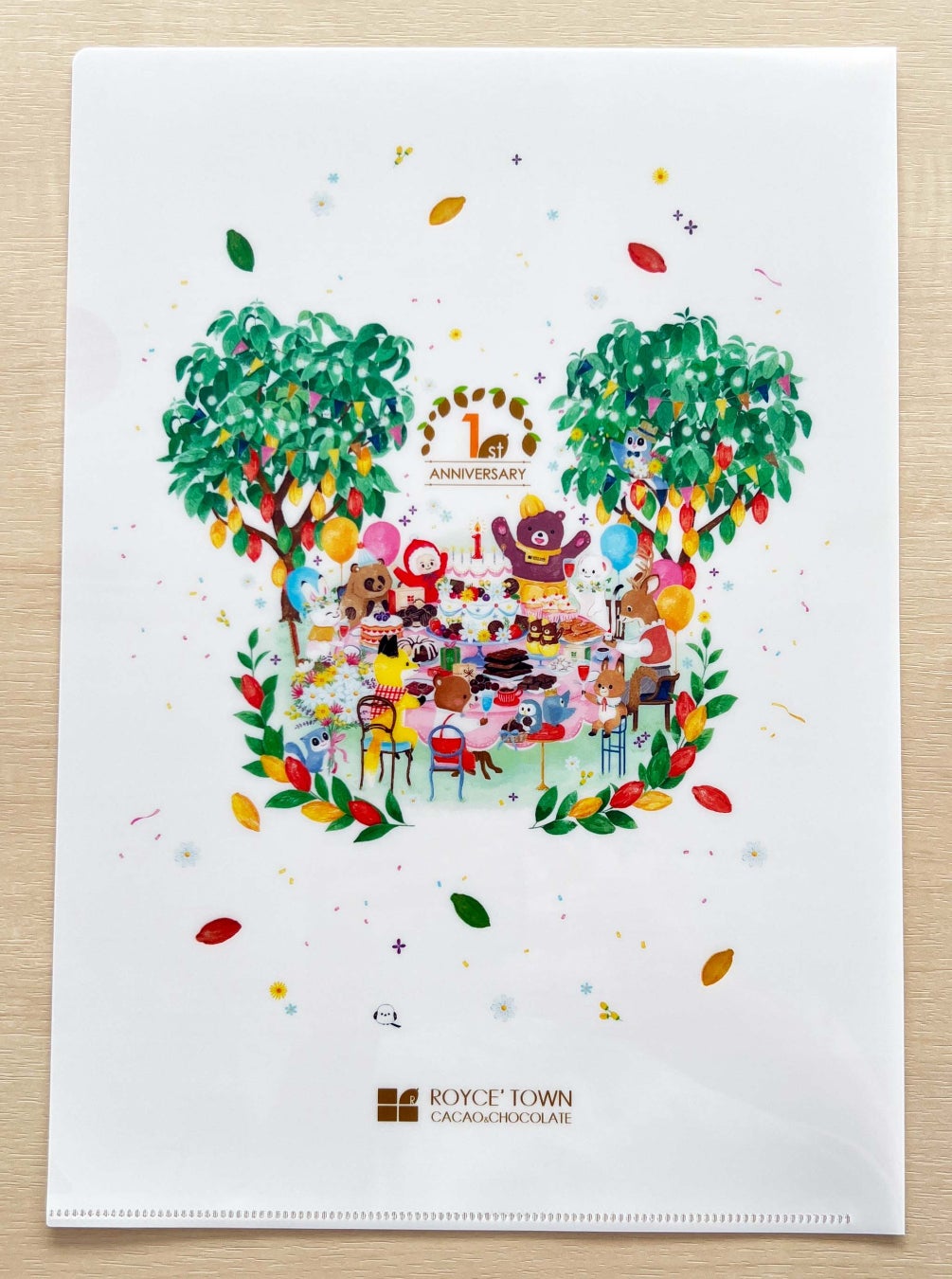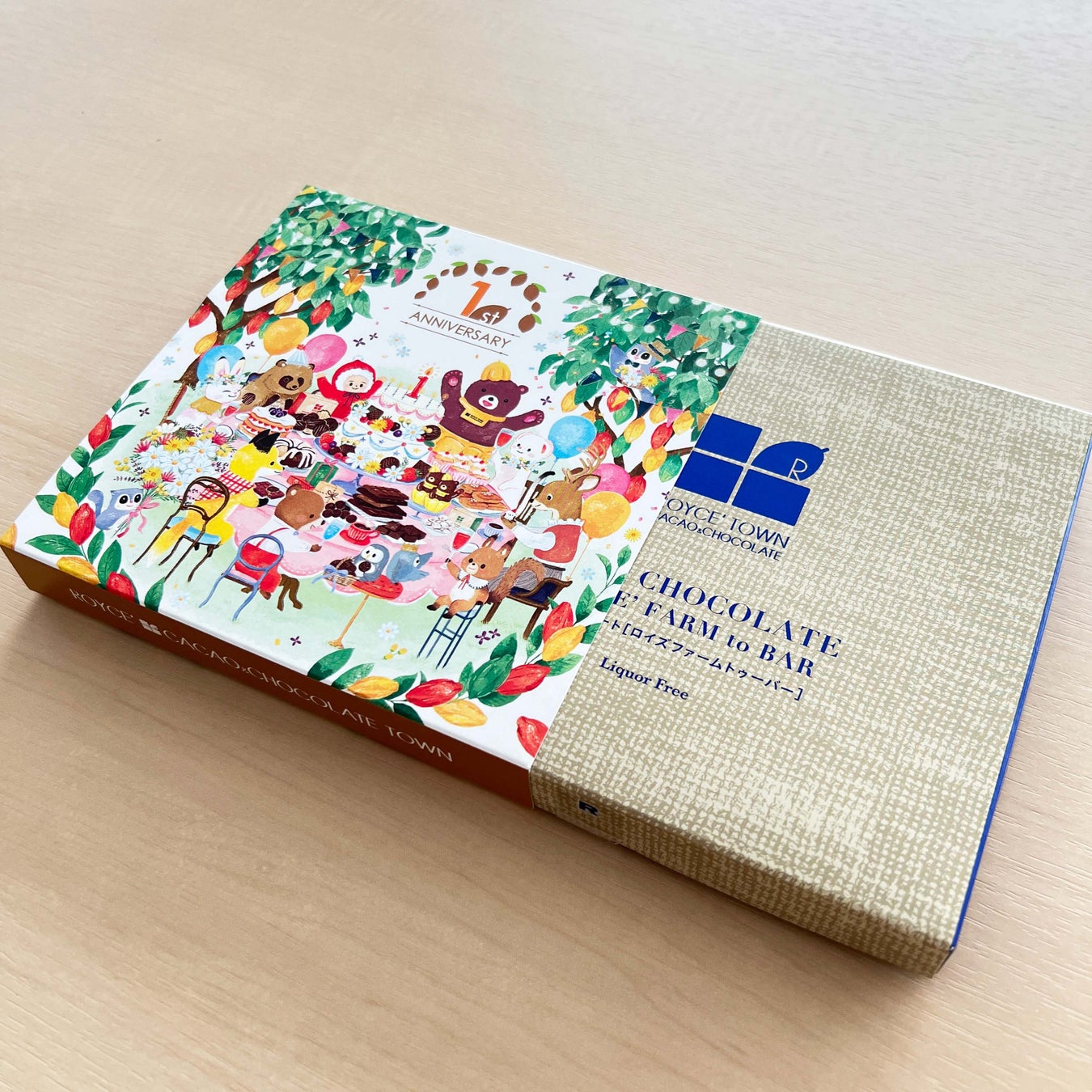 生チョコレート[ロイズファームトゥーバー]を購入した方に、施設のマスコット“カカオクマ”と北海道に住まう動物たちが1周年をお祝いする様子を描いたスリーブをプレゼント!