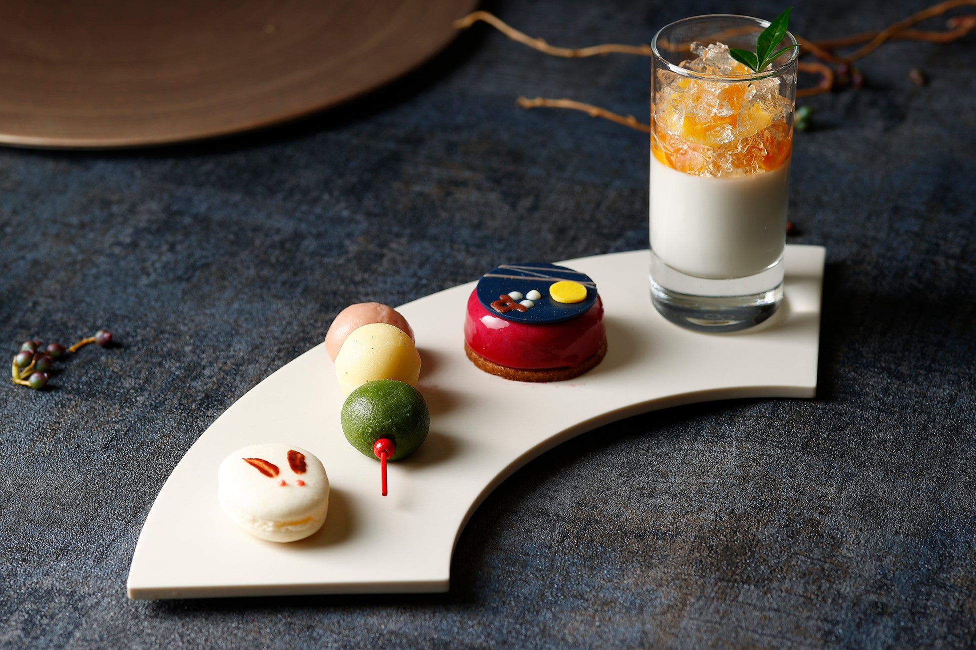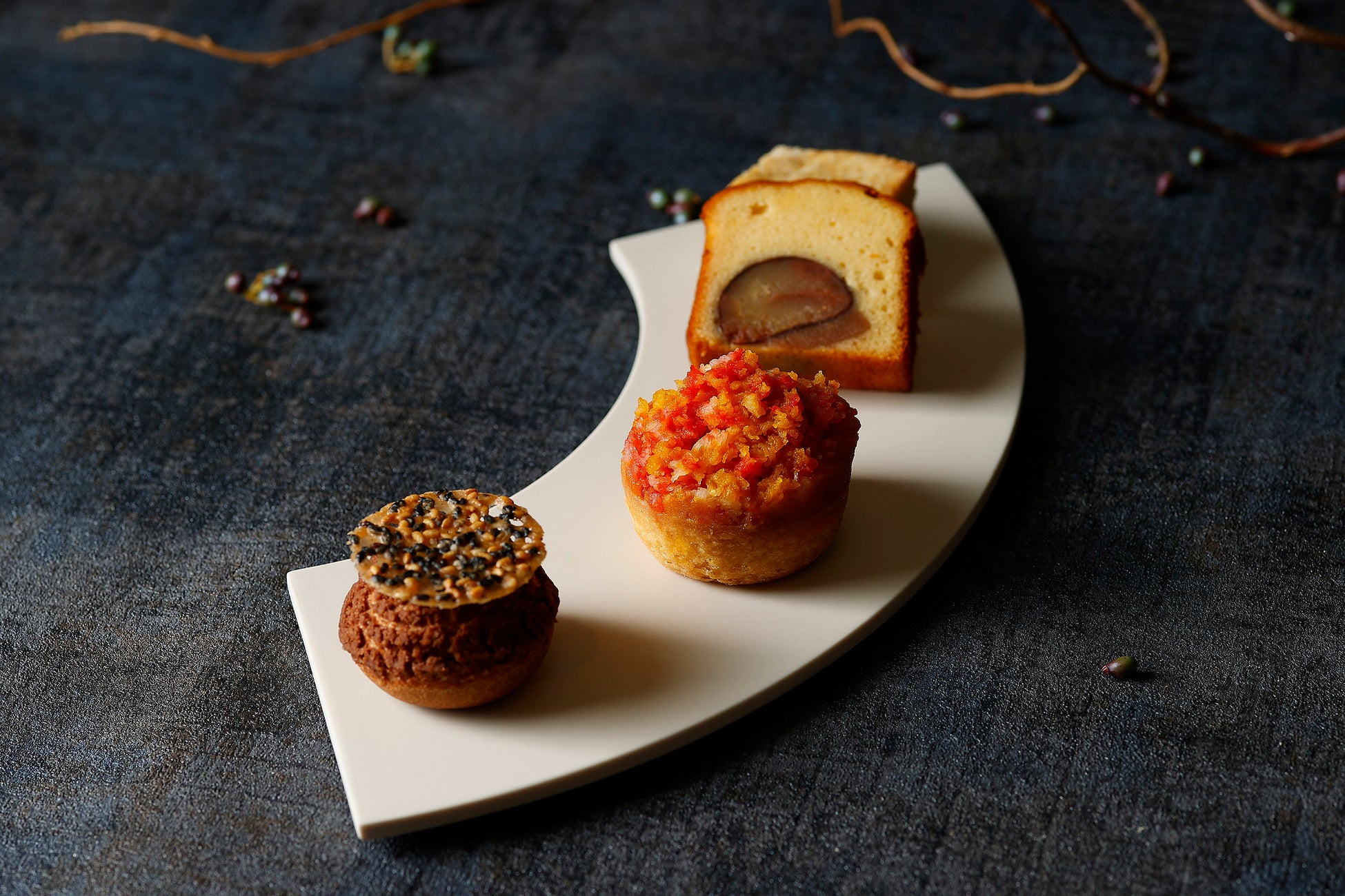 スイーツは、ごろんと入った栗が半月のような「和栗のパウンドケーキ」や、柿のコンポートと桂花陳酒のジュレを月のきらめきに見立てた「早生柿のパンナコッタ」など、月を連想させる品々のほか、ペストリー料理長生野剛哉が六甲山で見た秋の景色から着想を得て誕生した かぼちゃのタルト「紅葉」がミニサイズで登場。ベースになるアーモンドと白餡のタルトに、裏ごししたかぼちゃ餡を竹串でのせていく和菓子の技法を取り入れ、木々が秋色に染まる様子を表現いたしました。セイボリーは、栗とマッシュルームのサラダをムースが覆う「栗のムース トリュフ風味」など、満月をイメージした3種が揃います。