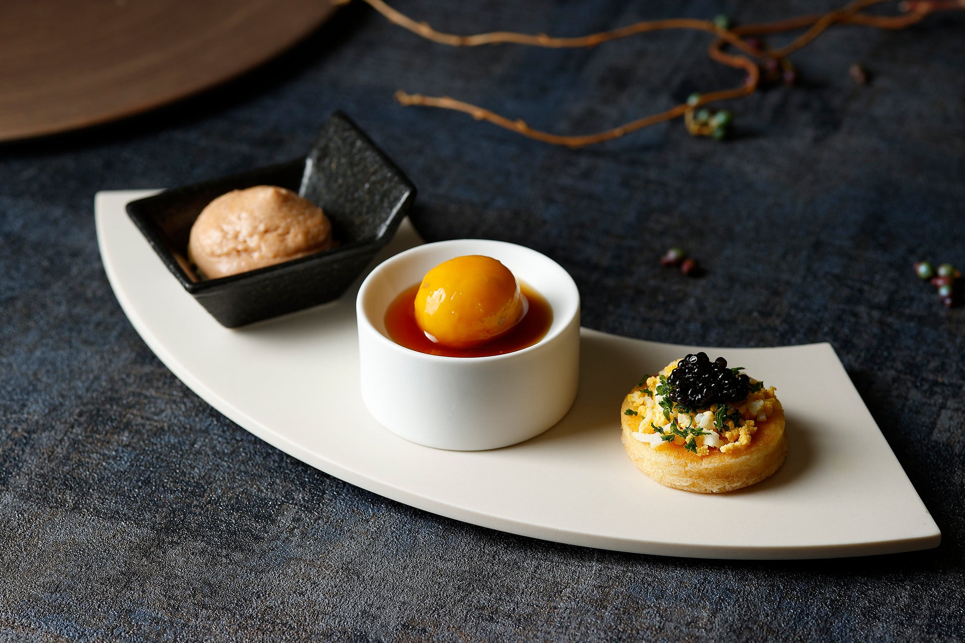 栗のムース トリュフ風味 / かぼちゃと海老の白玉 みたらし風 / じゃがいものクレープスフレ イタリア産キャビア添え