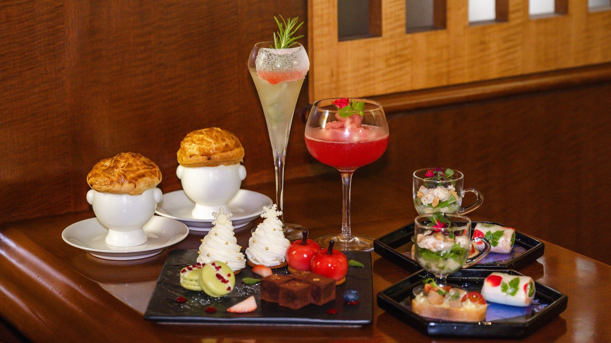 シャンパンにパール入りのオレンジリキュールを合わせ、グラスの縁に砂糖を飾ったスノーカクテルで乾杯。雪化粧したもみの木をイメージした「ホワイトモンブラン」や、小江戸川越ならではの和素材を使用した「日本酒のガナッシュ」、「あん肝の和風オープンサンド」など趣向を凝らしたスイーツとセイボリーで冬のワクワク感を演出いたします。